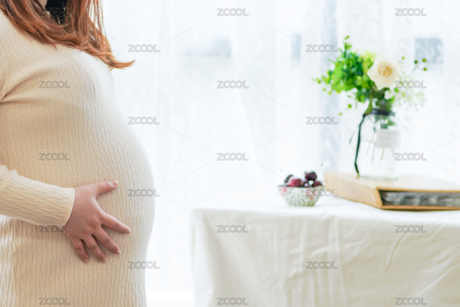 窗边孕妇肚子和车厘子樱桃