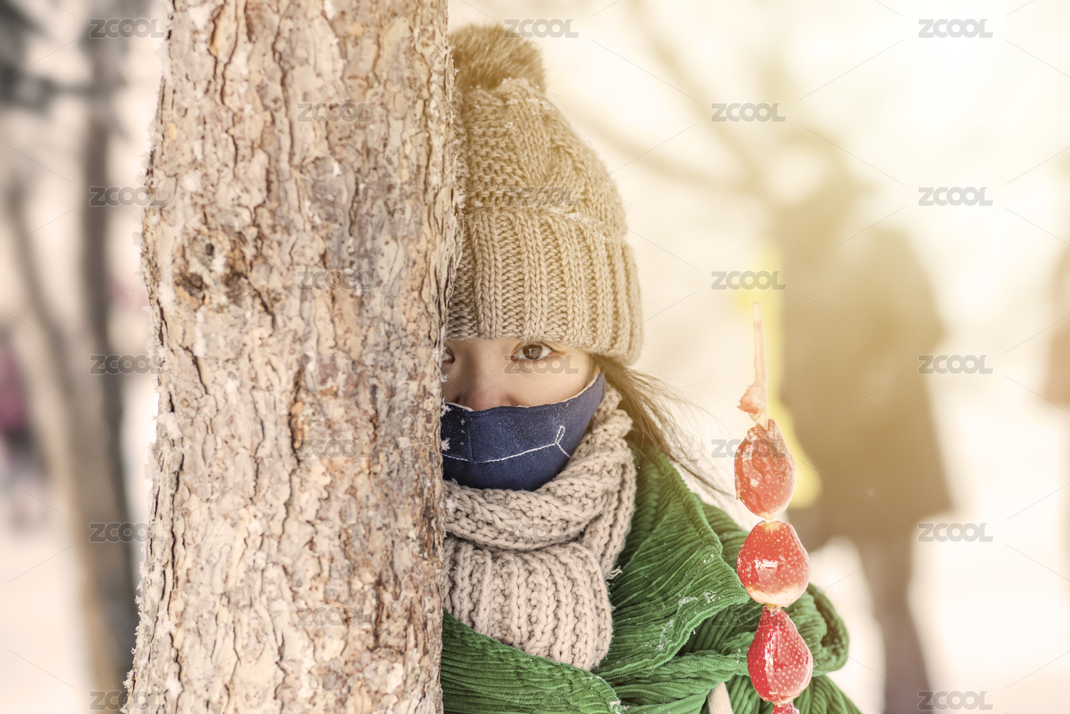 穿黄色卫衣蓝色牛仔裤带帽子的少女