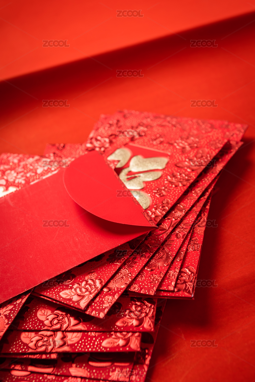 一叠放在红色背景上的春节压岁钱红包