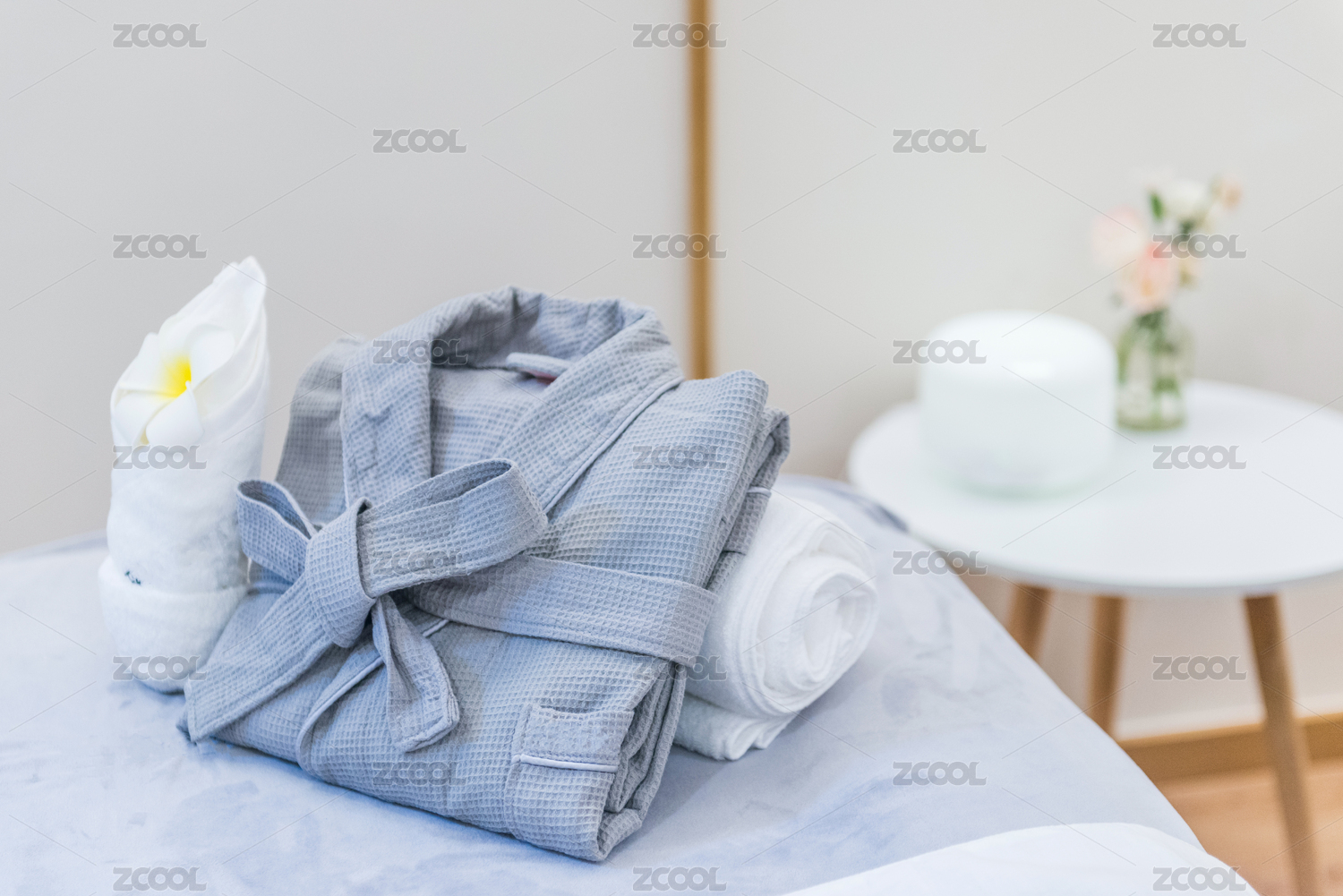 床头整齐叠放的浴袍和小茶几上的香薰机