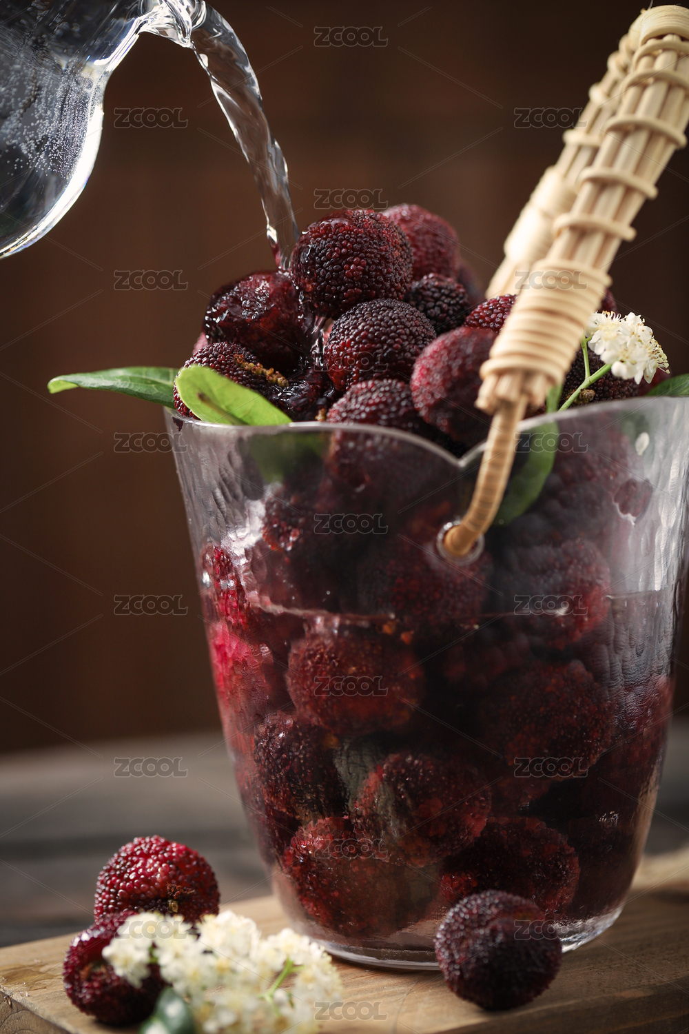 成熟的杨梅盛在白色容器里,一片绿叶点缀,放在木板上,虚化的绿色背景。