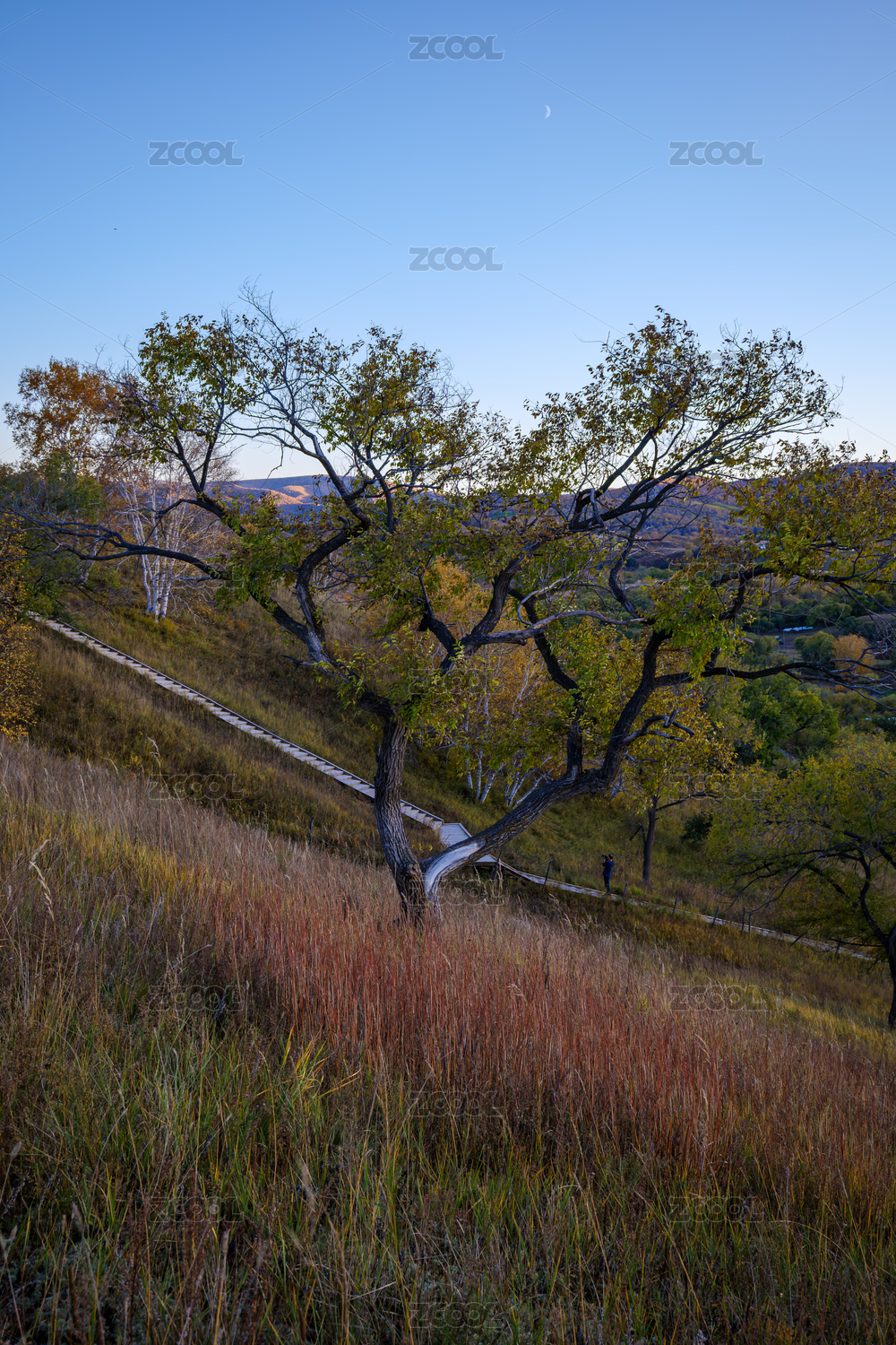 秋天日出下内蒙古坝上桦木沟的山坡草原树林