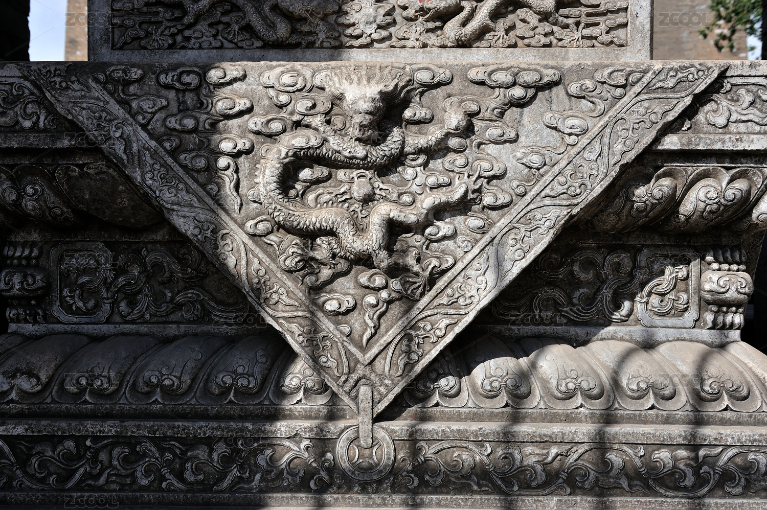 石雕龙纹与石狮基座