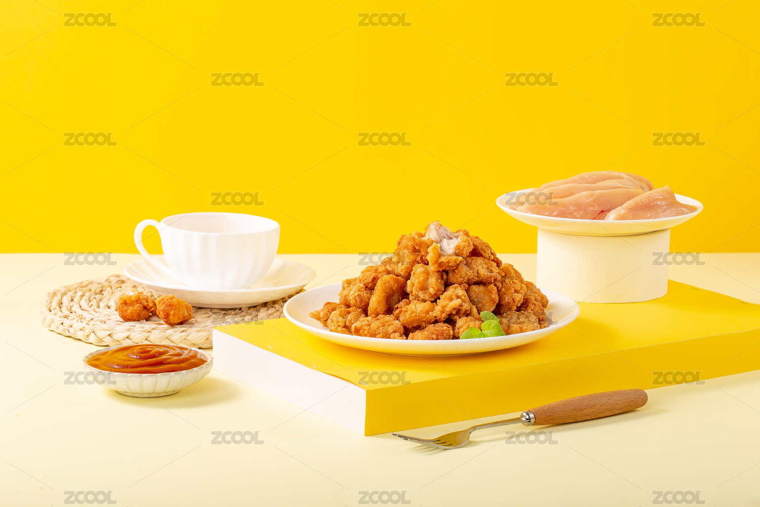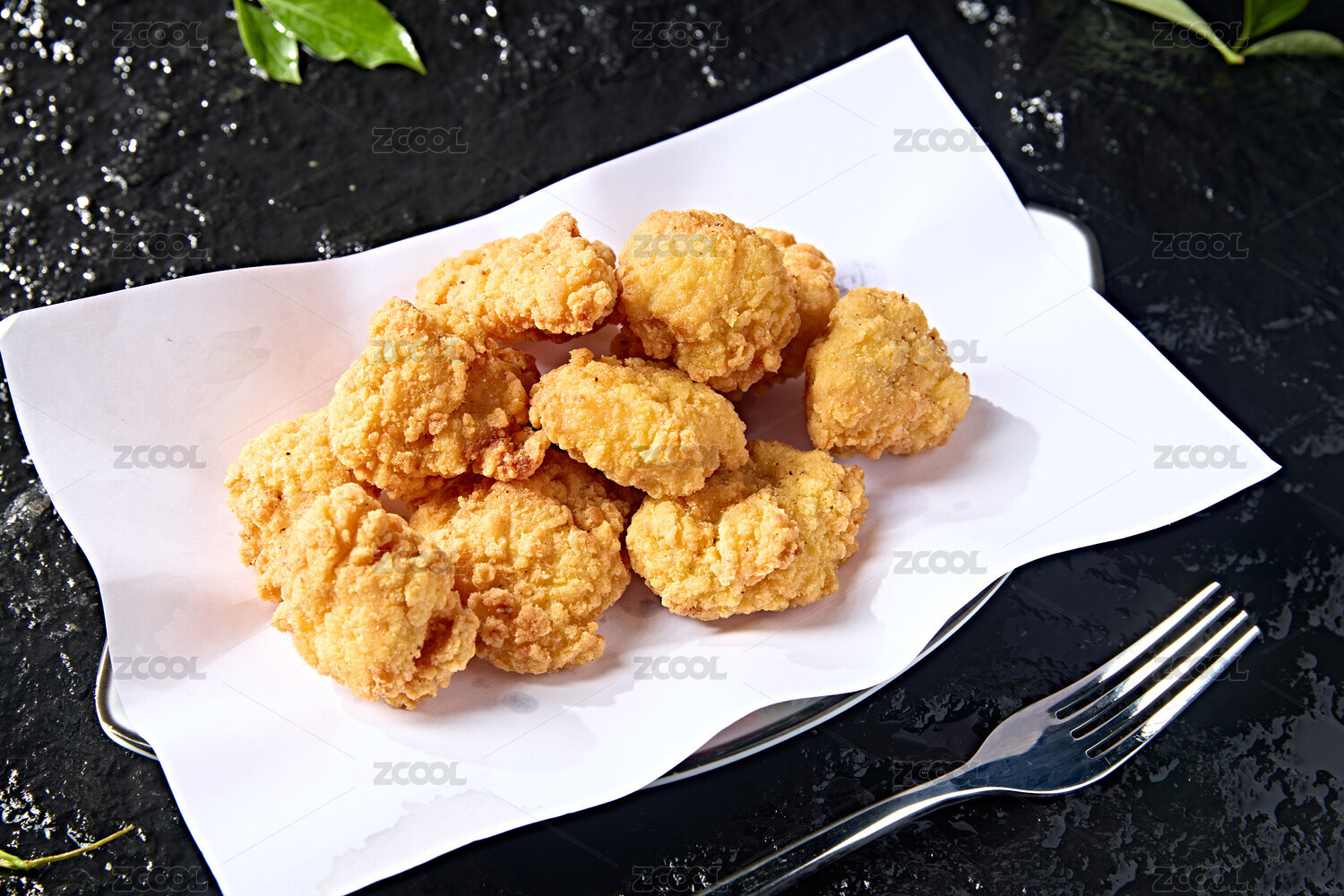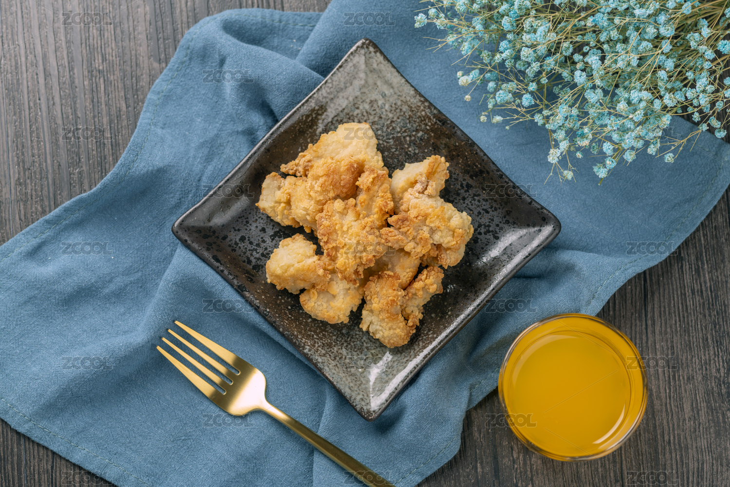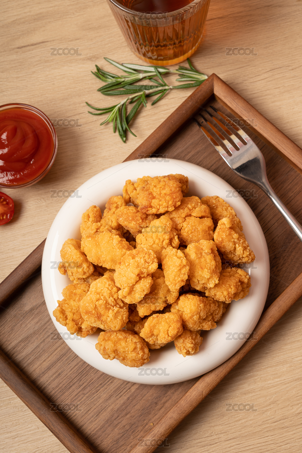 一盘炸鸡块炸鸡米花摆放在木桌面上