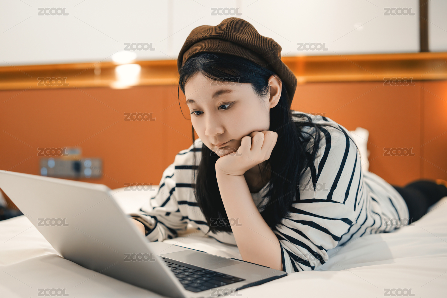 年轻女子在床上从事远程工作