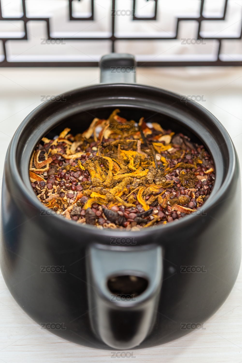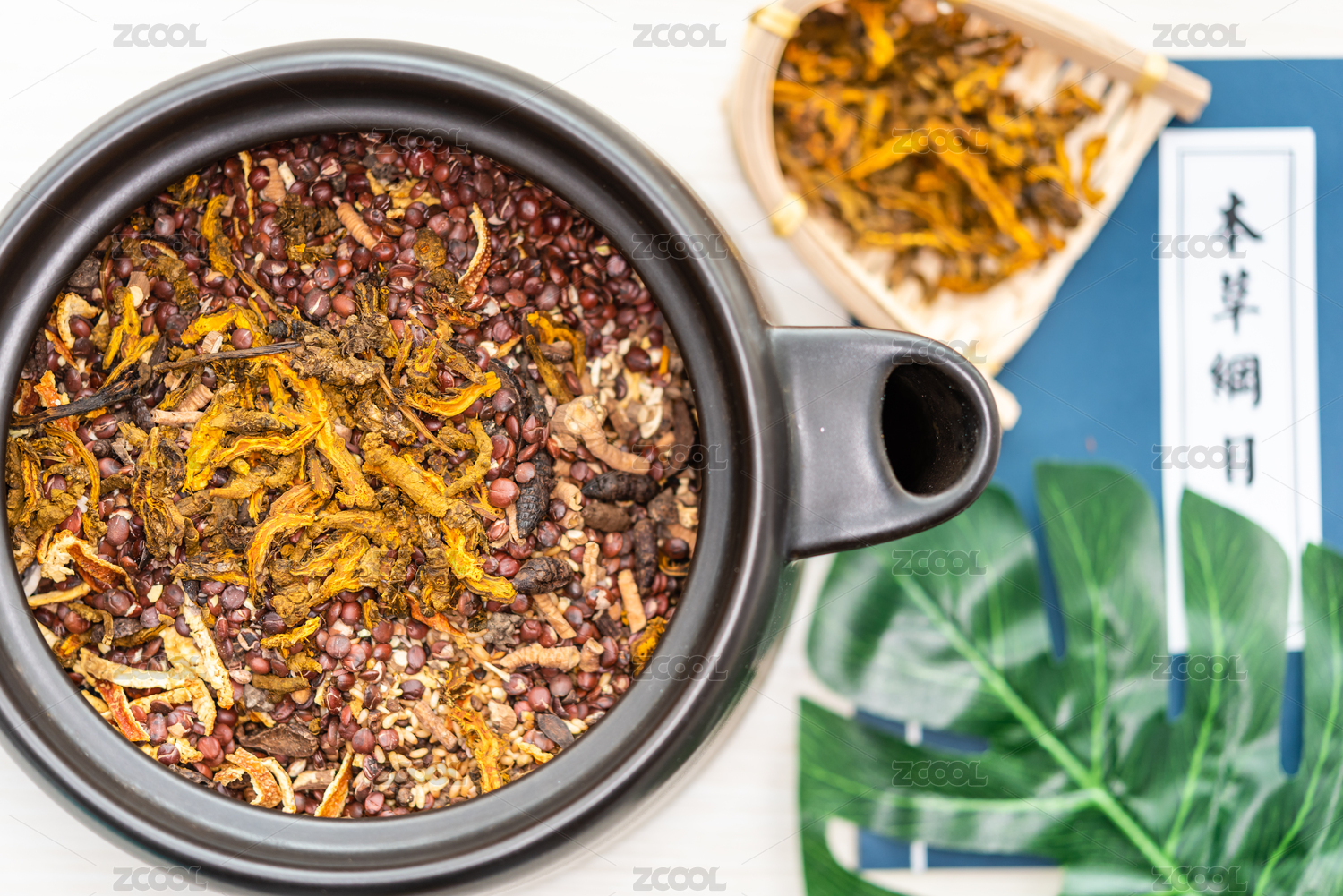穿着白大褂的老中医在铺满各种草药的桌前检查药品