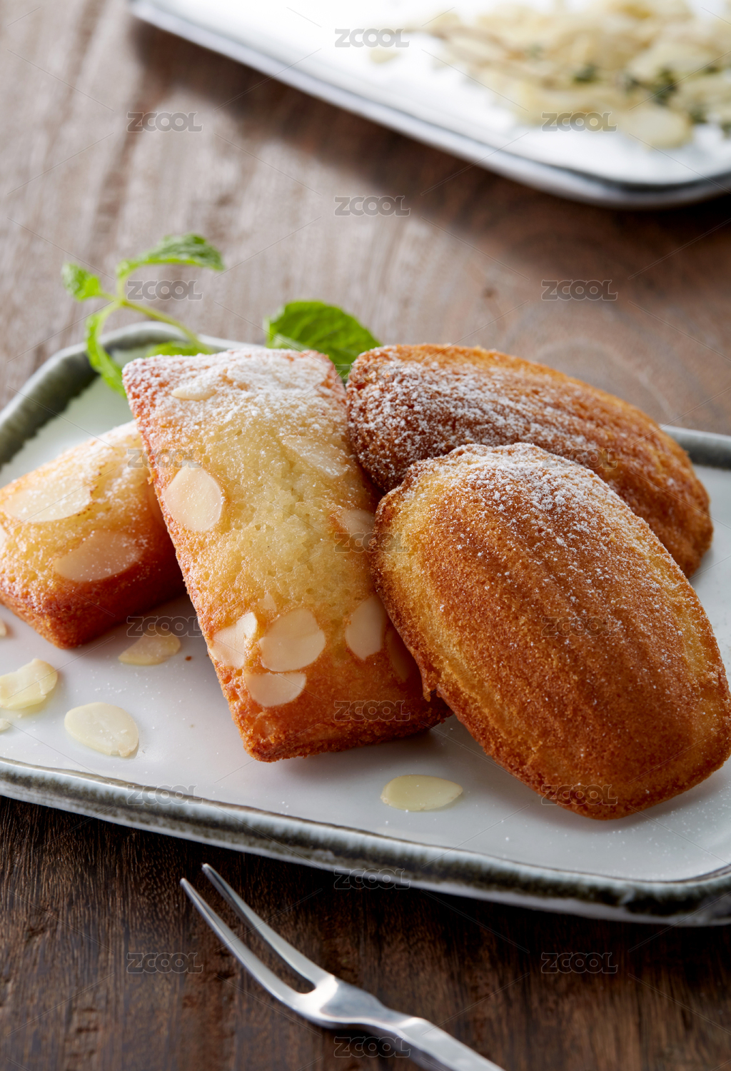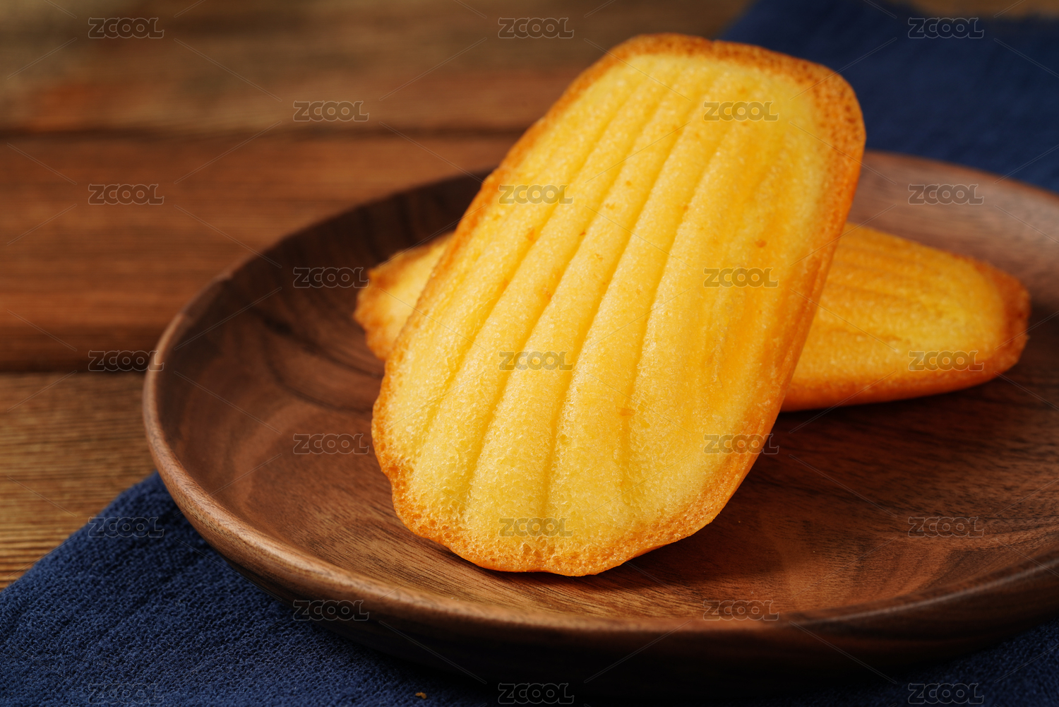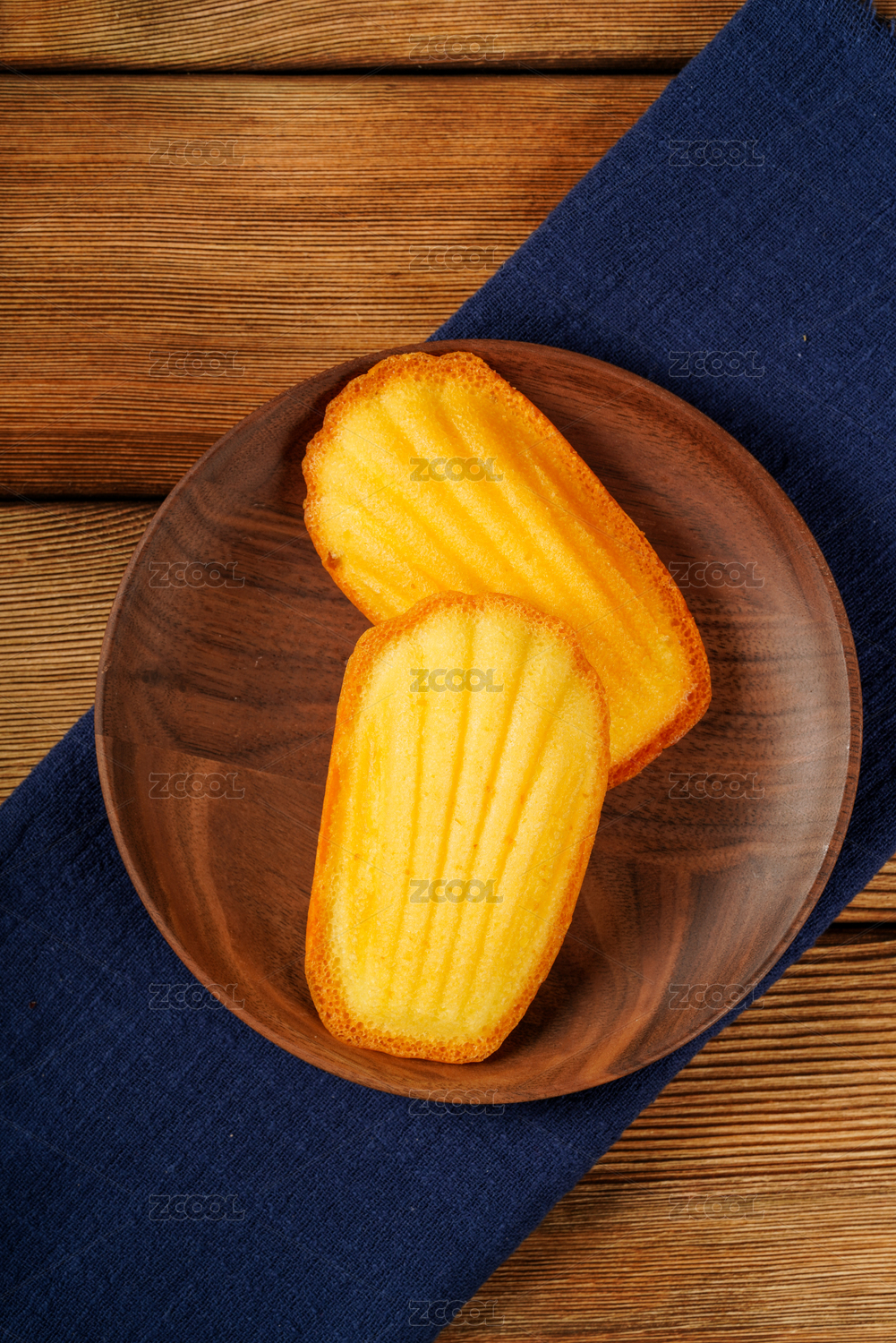 木质桌面上摆着一盘法式玛德琳蛋糕