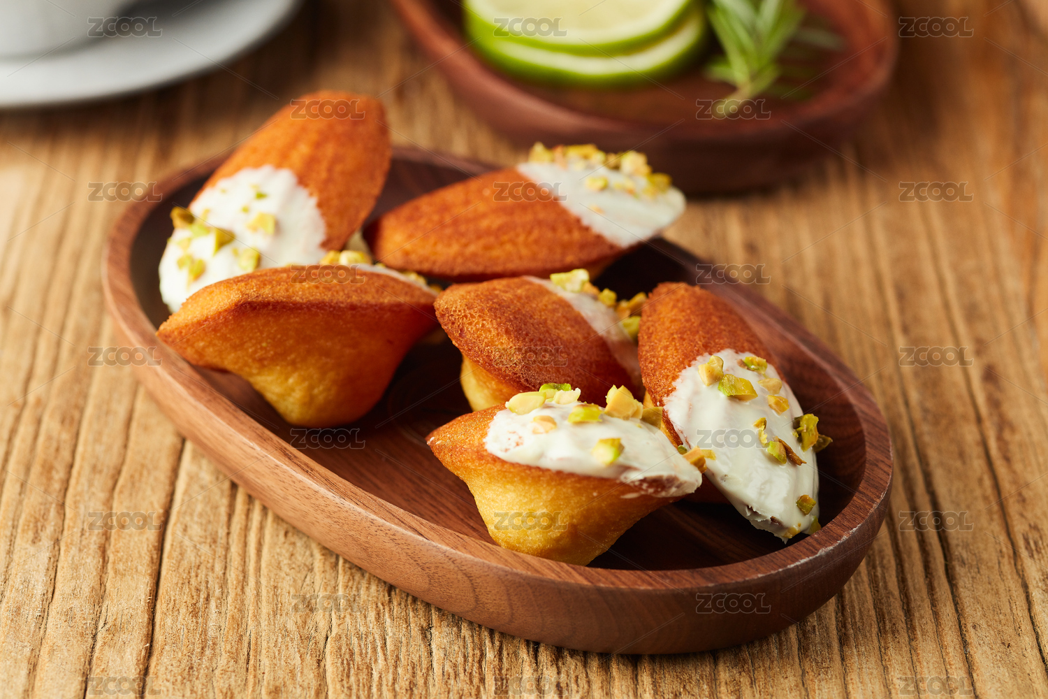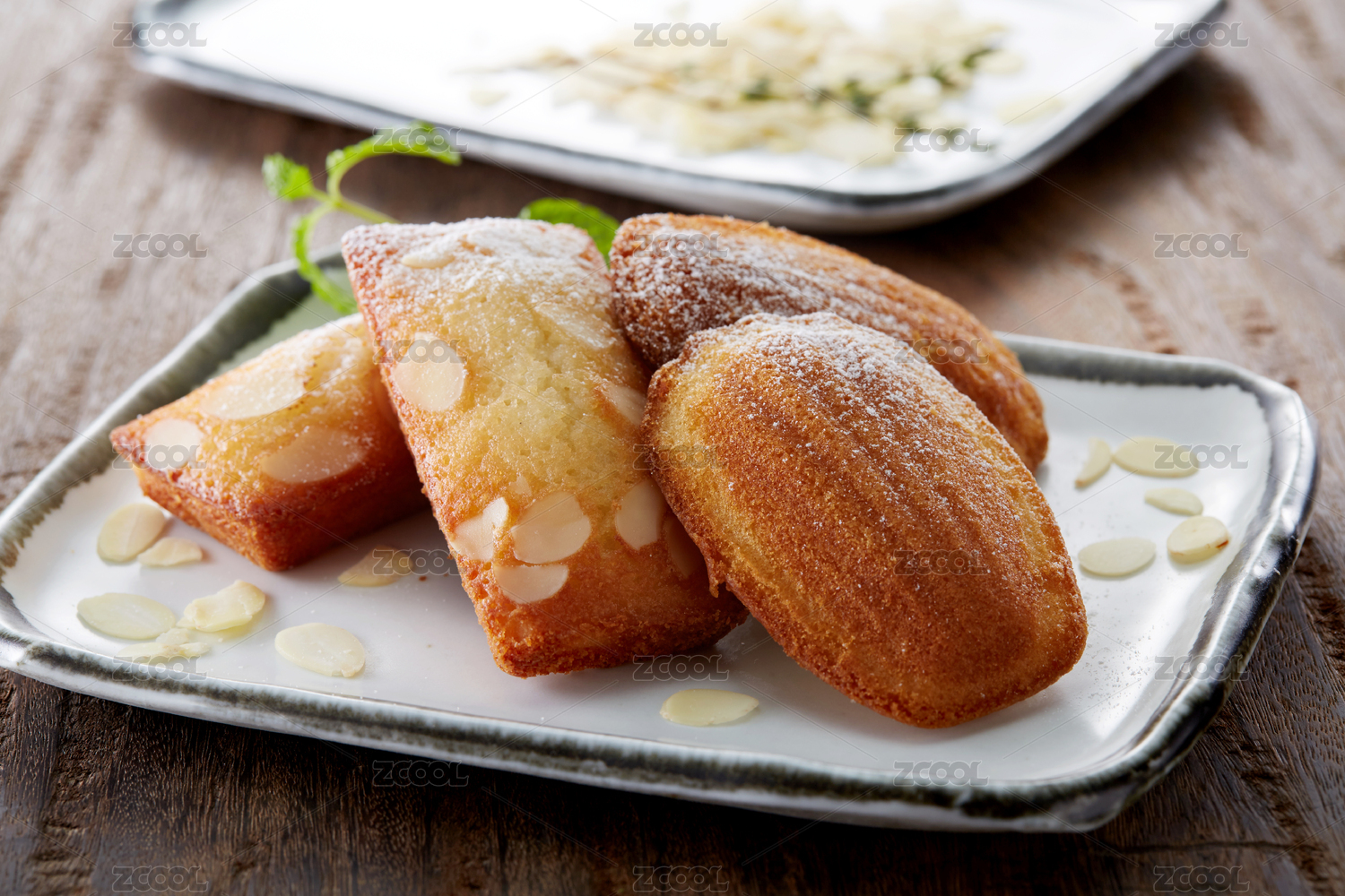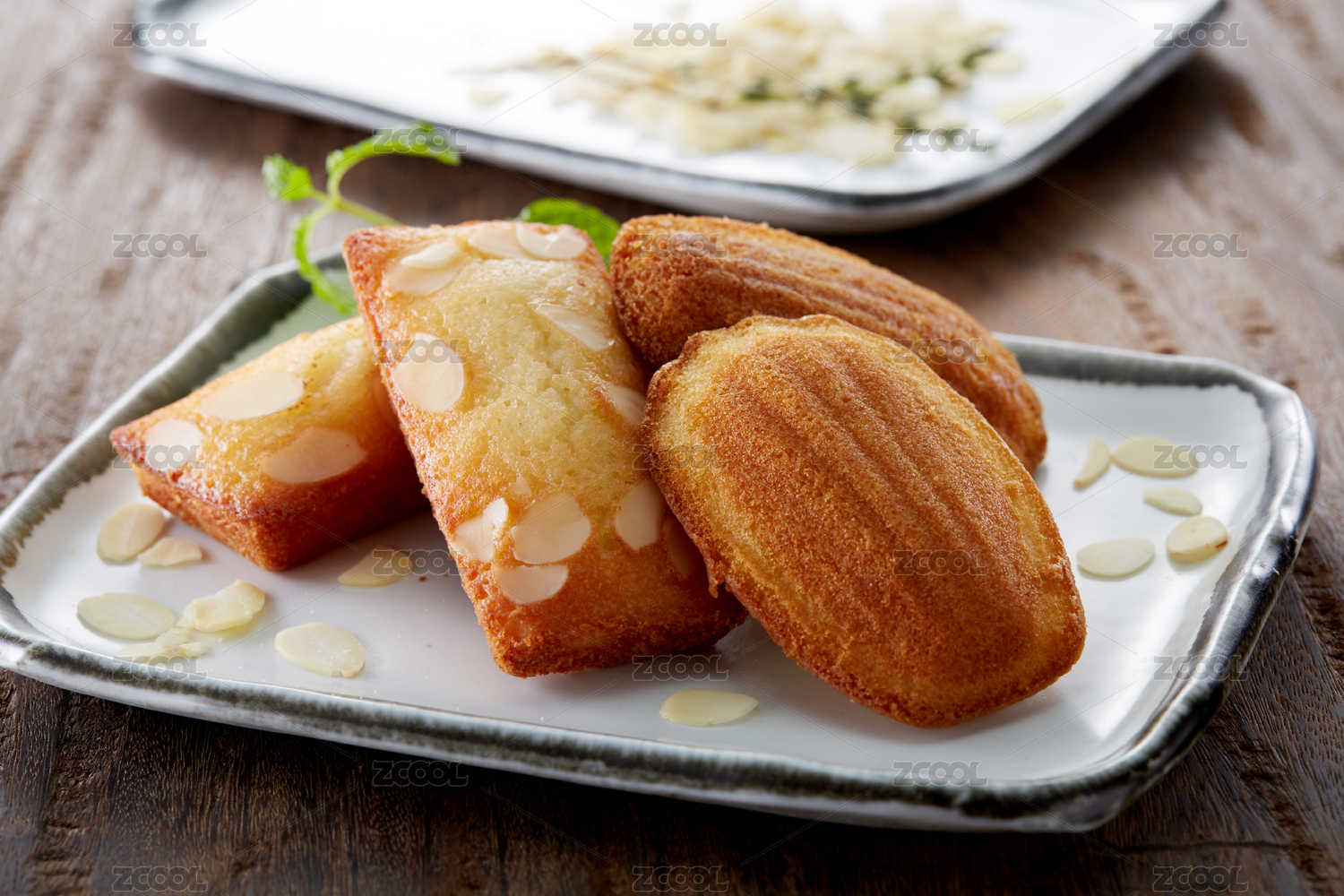 木质桌面上摆着一盘法式玛德琳蛋糕