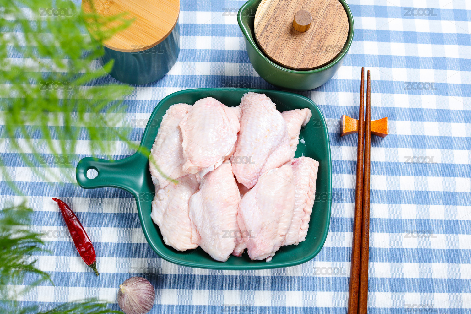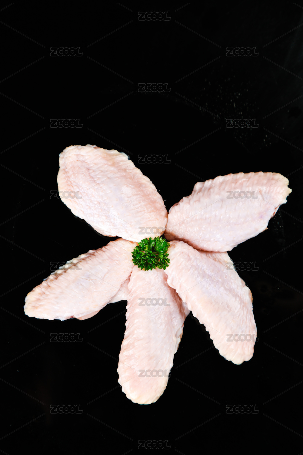 鸡中翅在白色背景上,绿色蔬菜叶点缀。