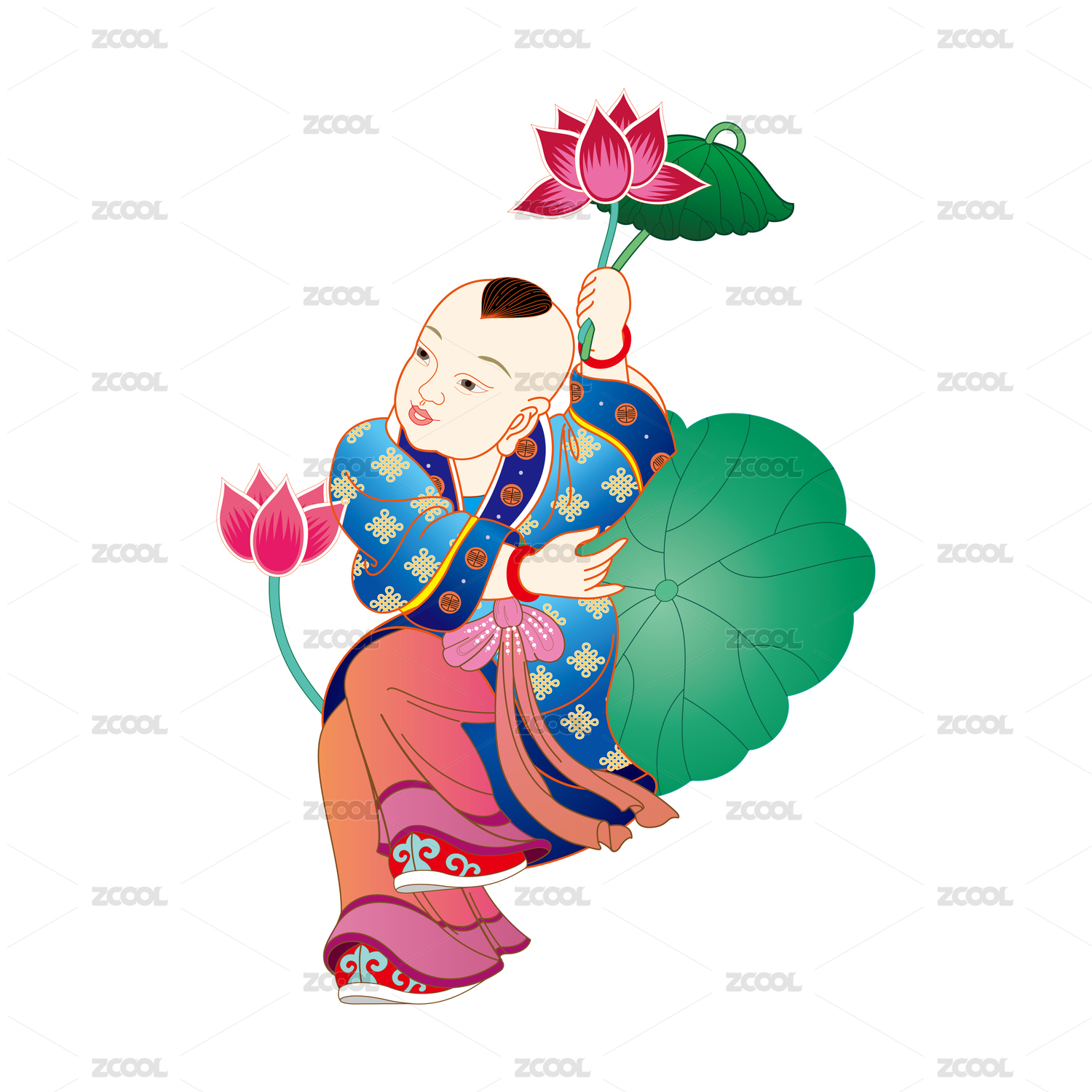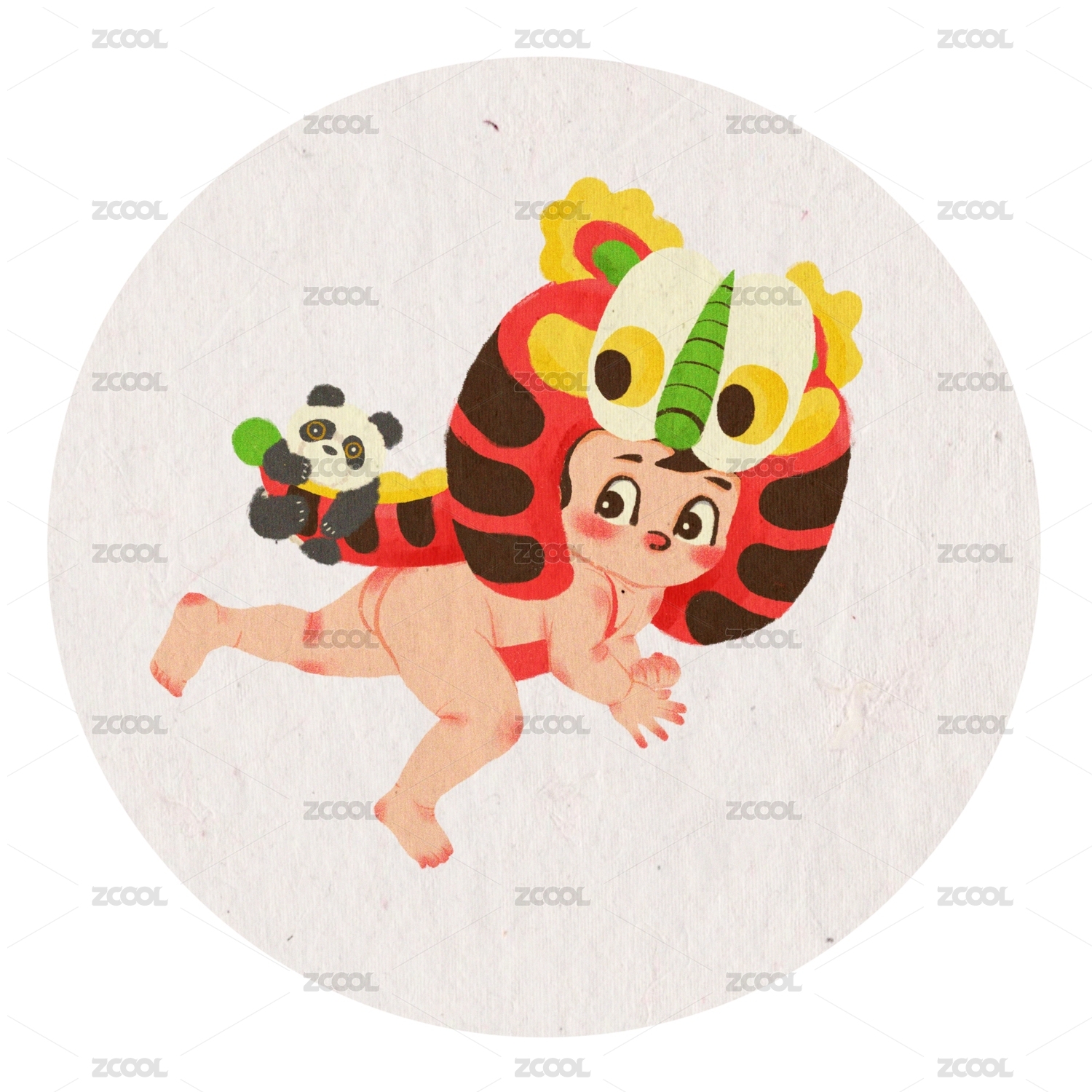 冬季胖娃娃和锦鲤的喜庆年画风格