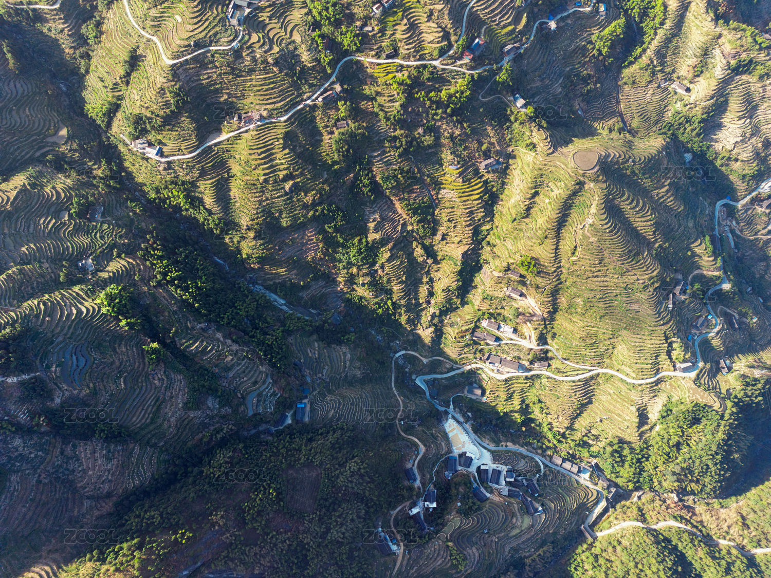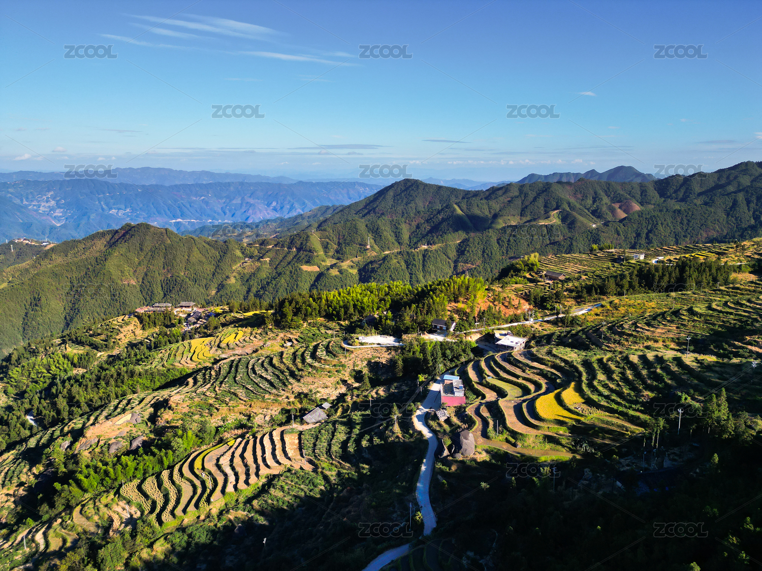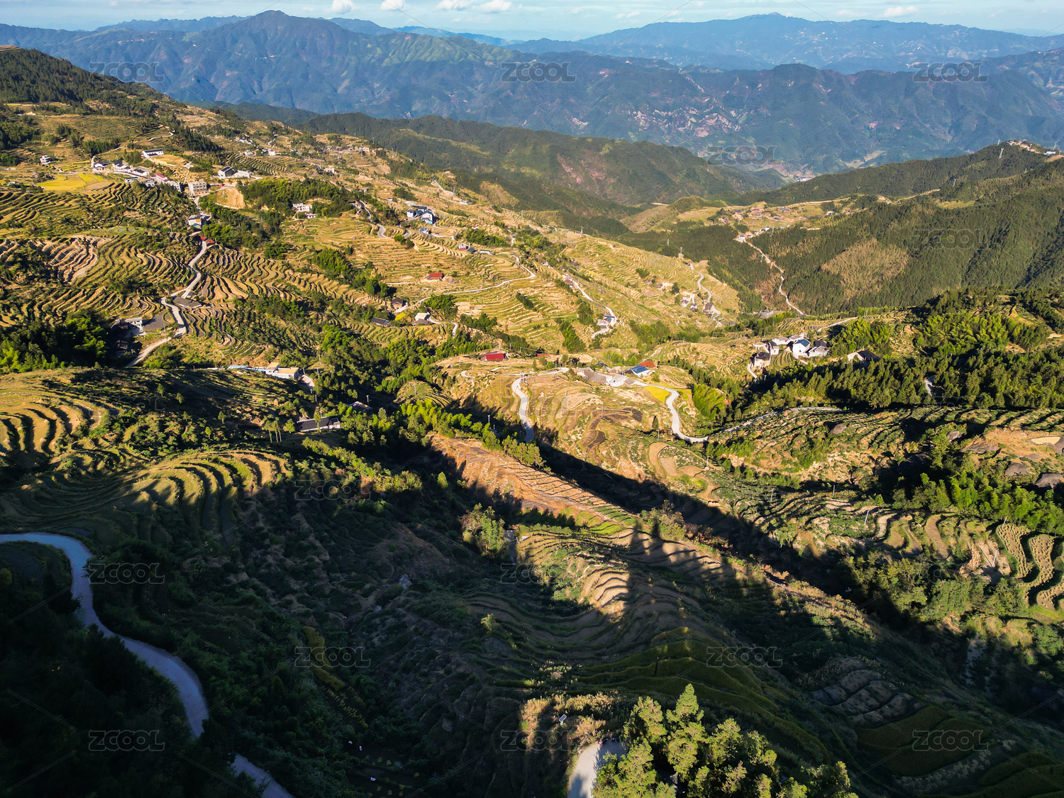 无人机航拍秋天大部分收割后的高山梯田