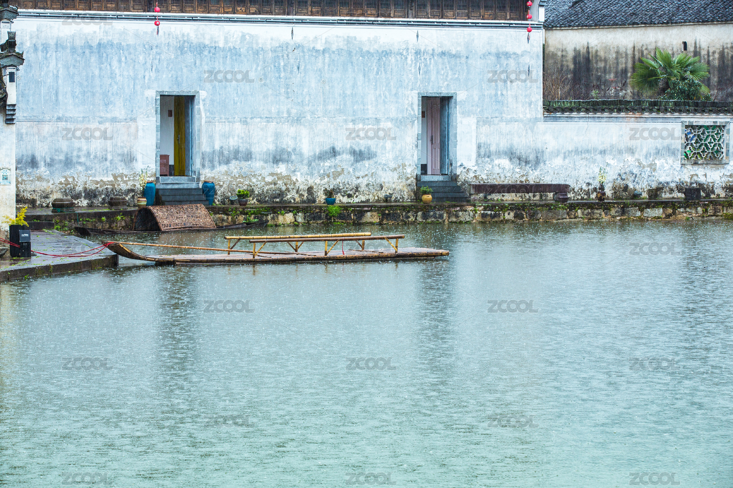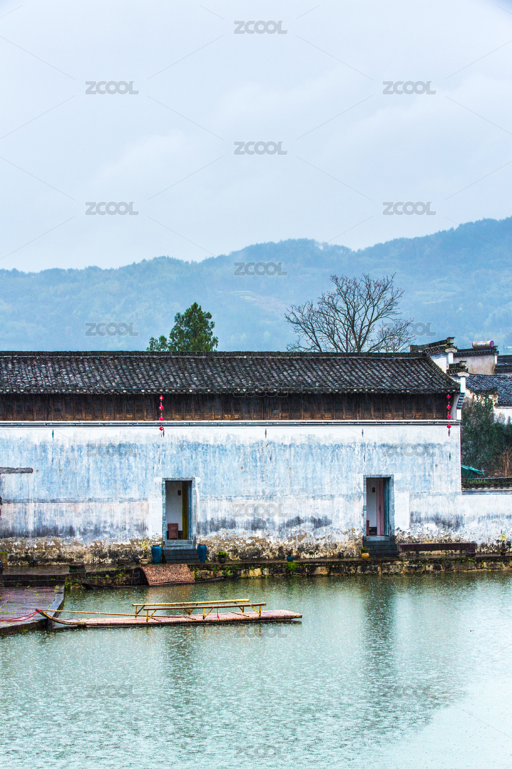 雨雾中的安徽省黄山市徽州区呈坎古镇景观