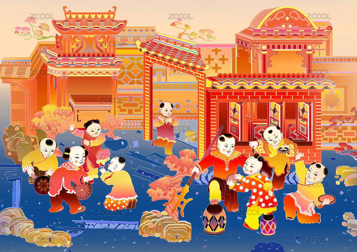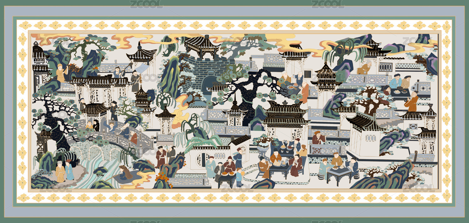 秋冬 徽州建筑文艺小清新手绘风景矢量