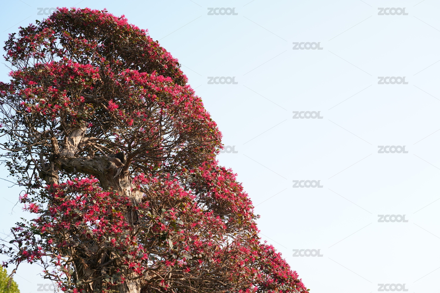 枝繁叶茂姿态优美的红花檵木桩景特写