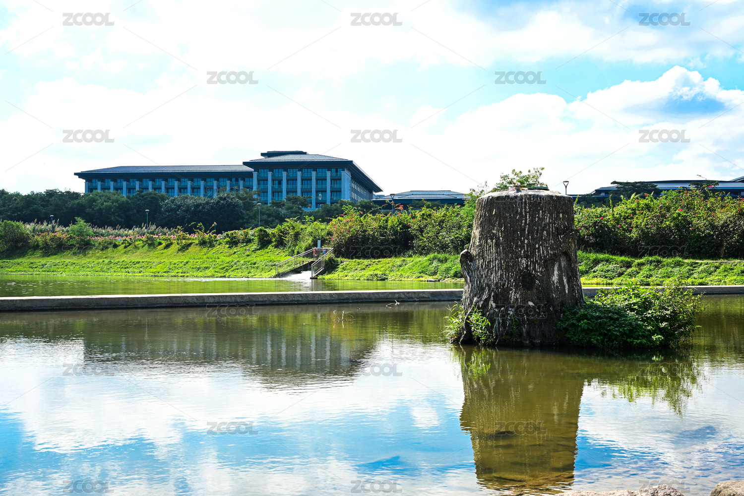 深圳坪山河公园河畔湖光倒影与老树桩景观