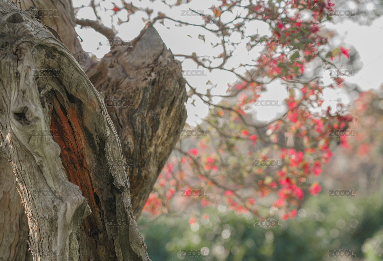 老树新花姿态优美的红花檵木桩景特写