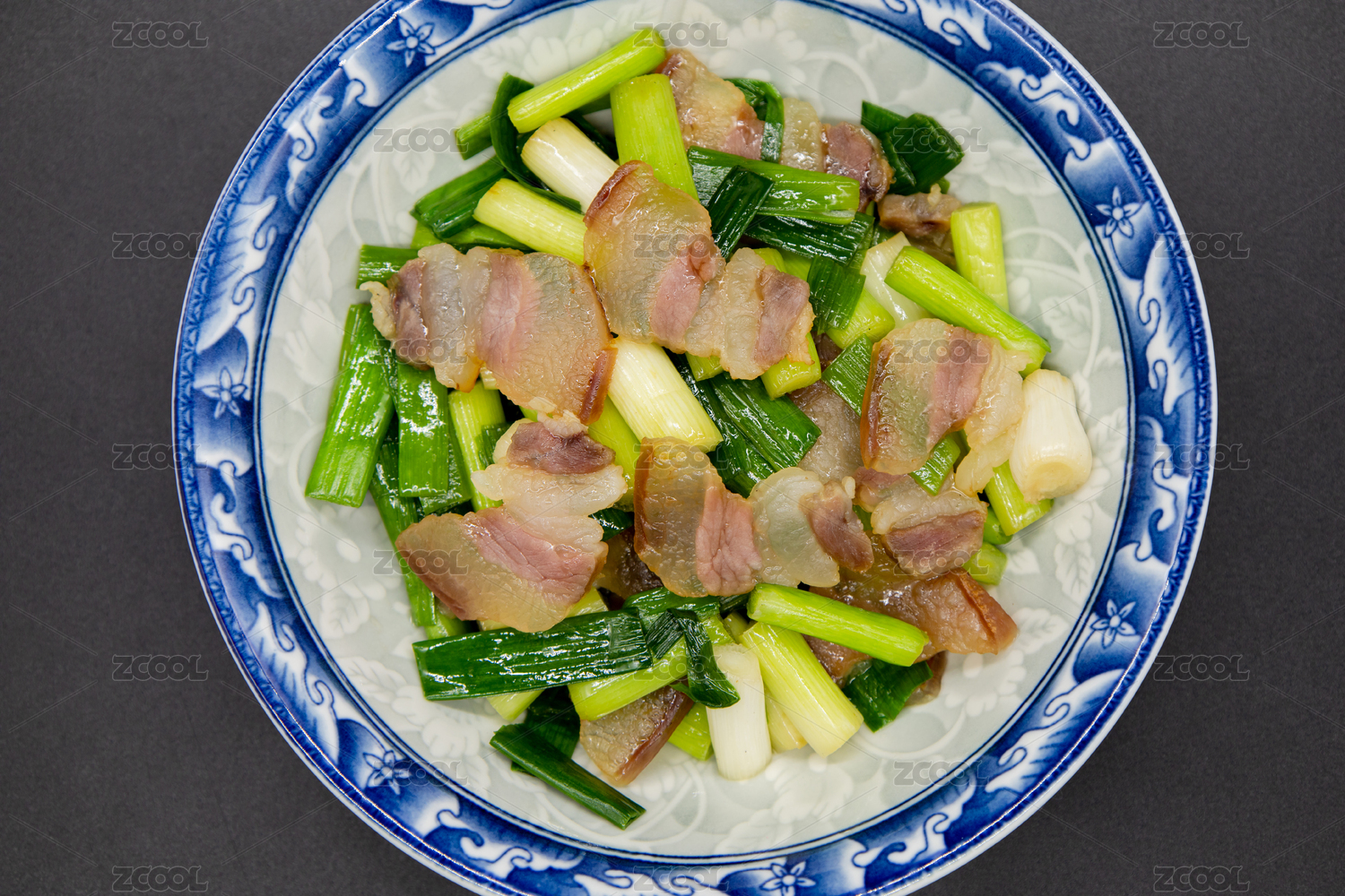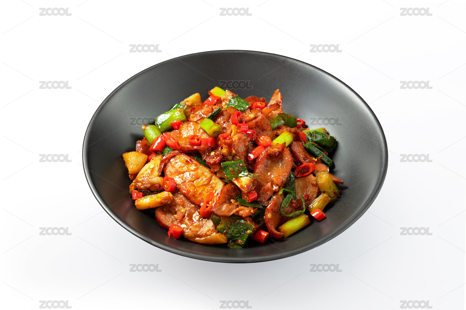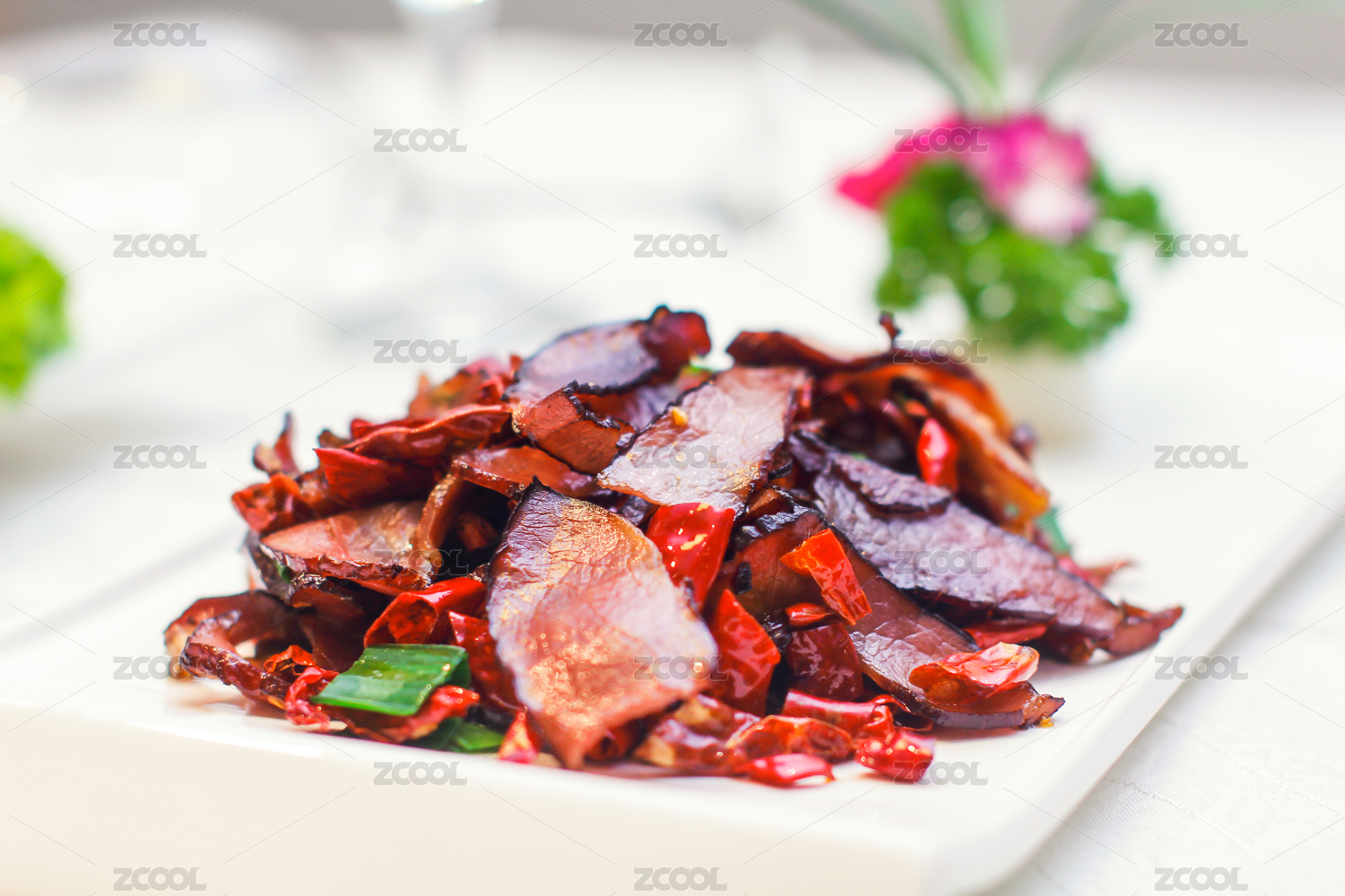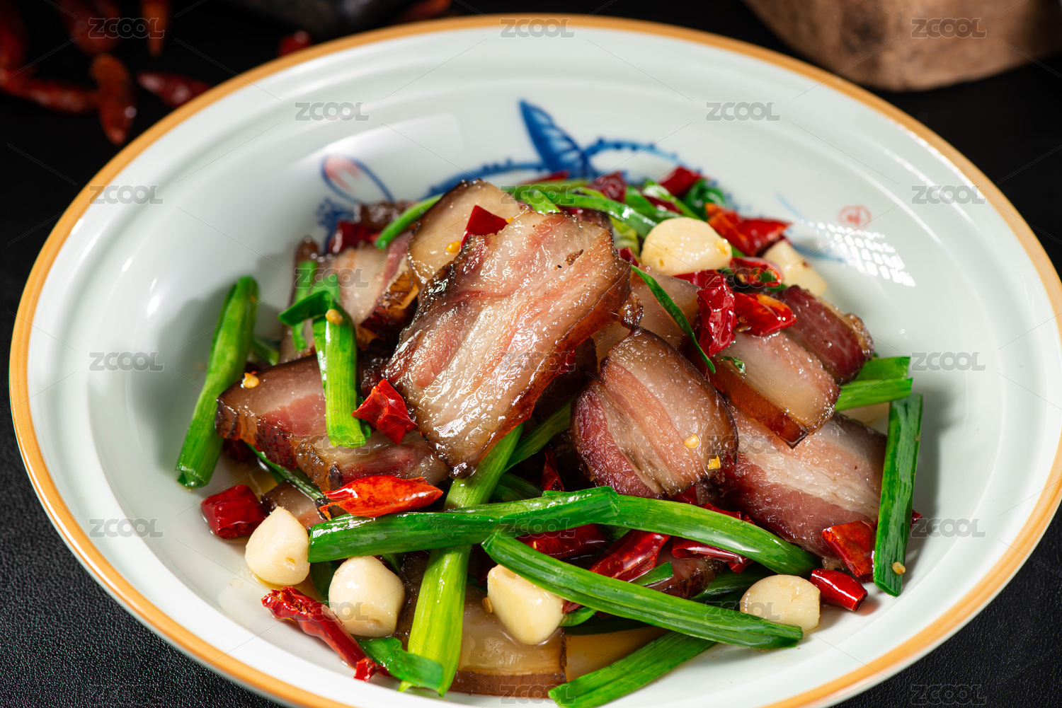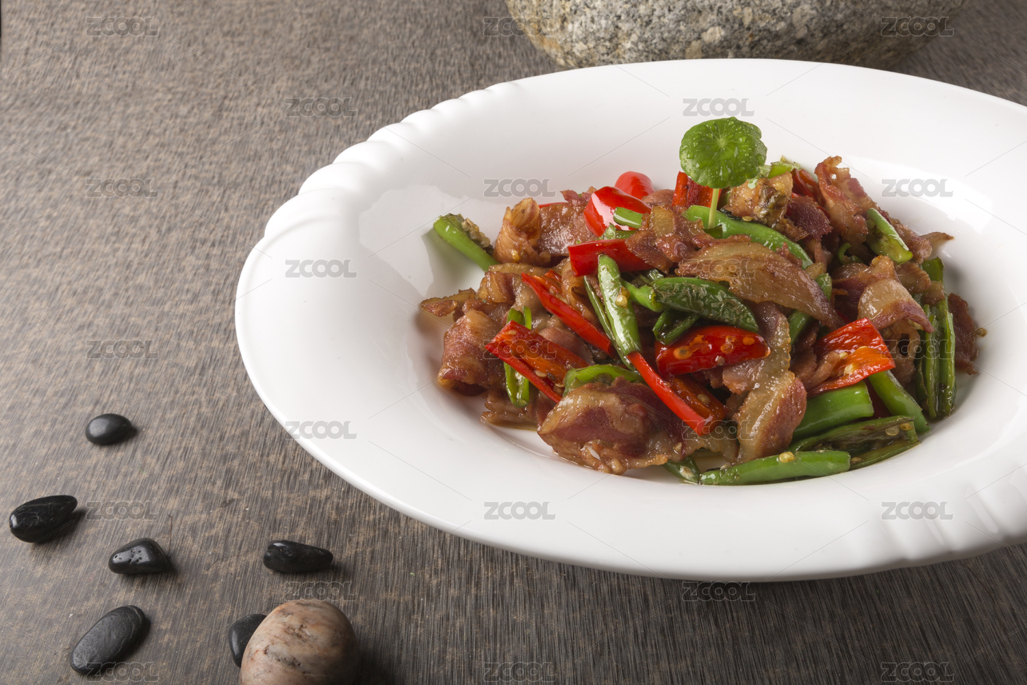 木盒上盘子里筷子夹着的红薯粉炒腊肉