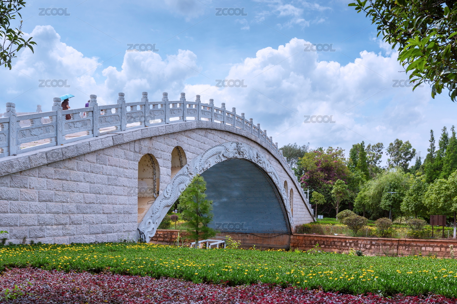 云南昆明星海湿地公园蓝天白云衬托石拱桥