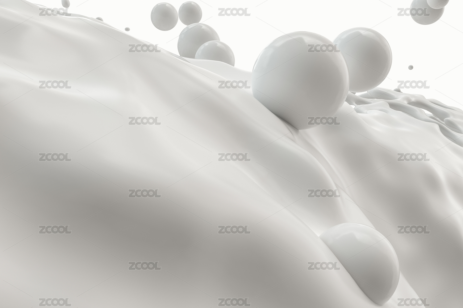 空中飞溅的创意形状白色液体与小球,三维渲染
