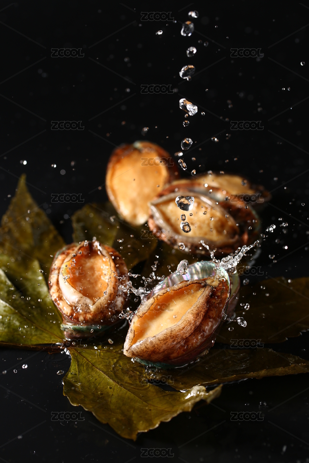 黑色背景里的四只溅起水花的鲜活鲍鱼
