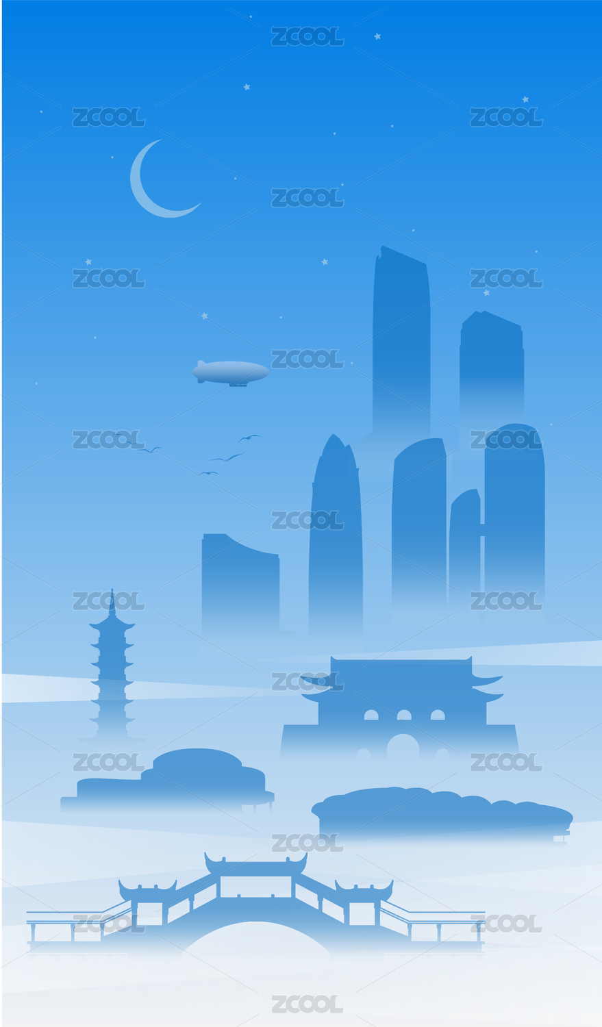 昆山城市建筑蓝色夜景手绘插画