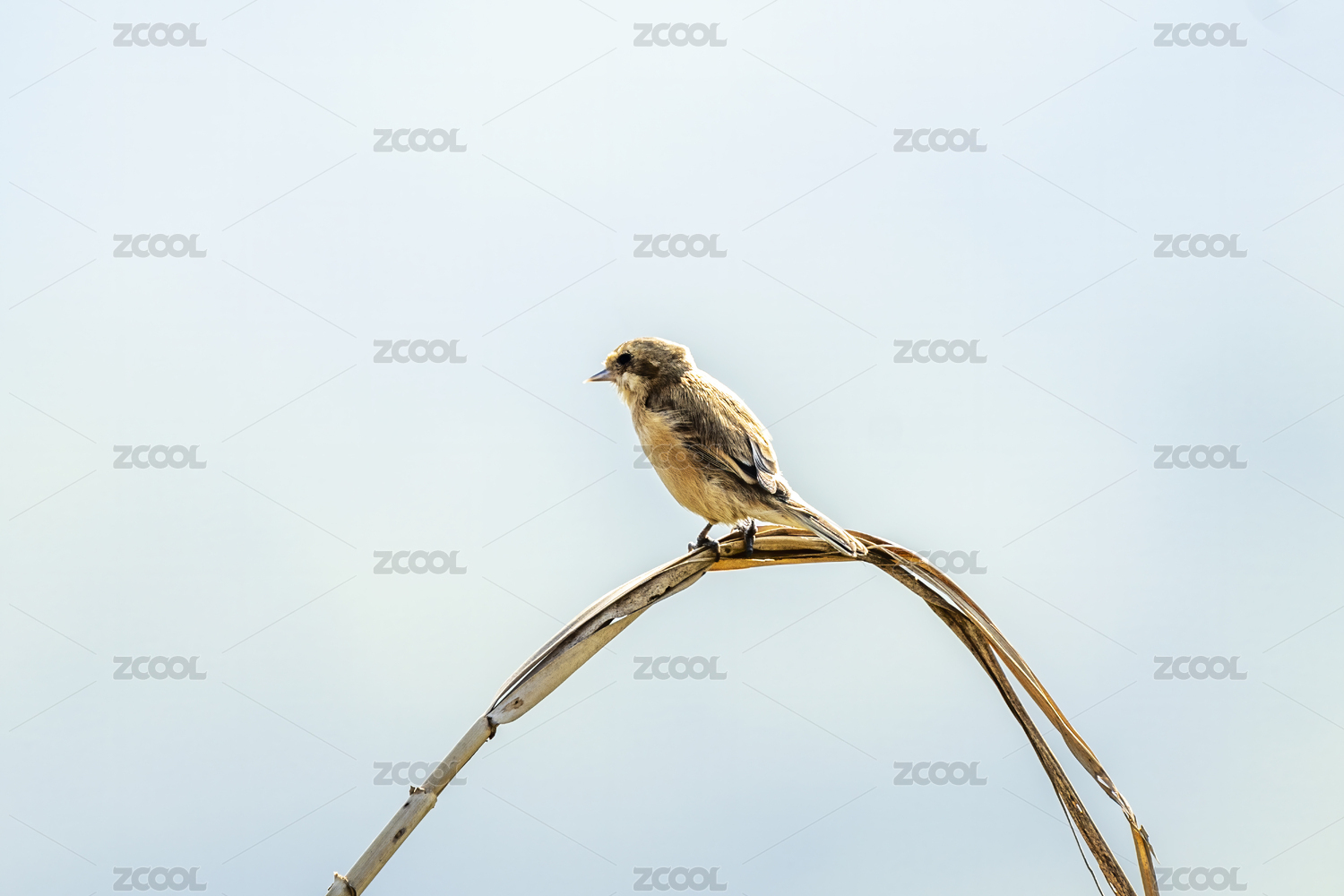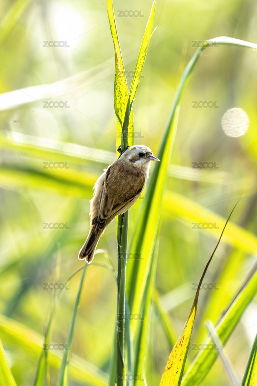 一只中华攀雀鸟攀附在芦苇枝上啄食小昆虫