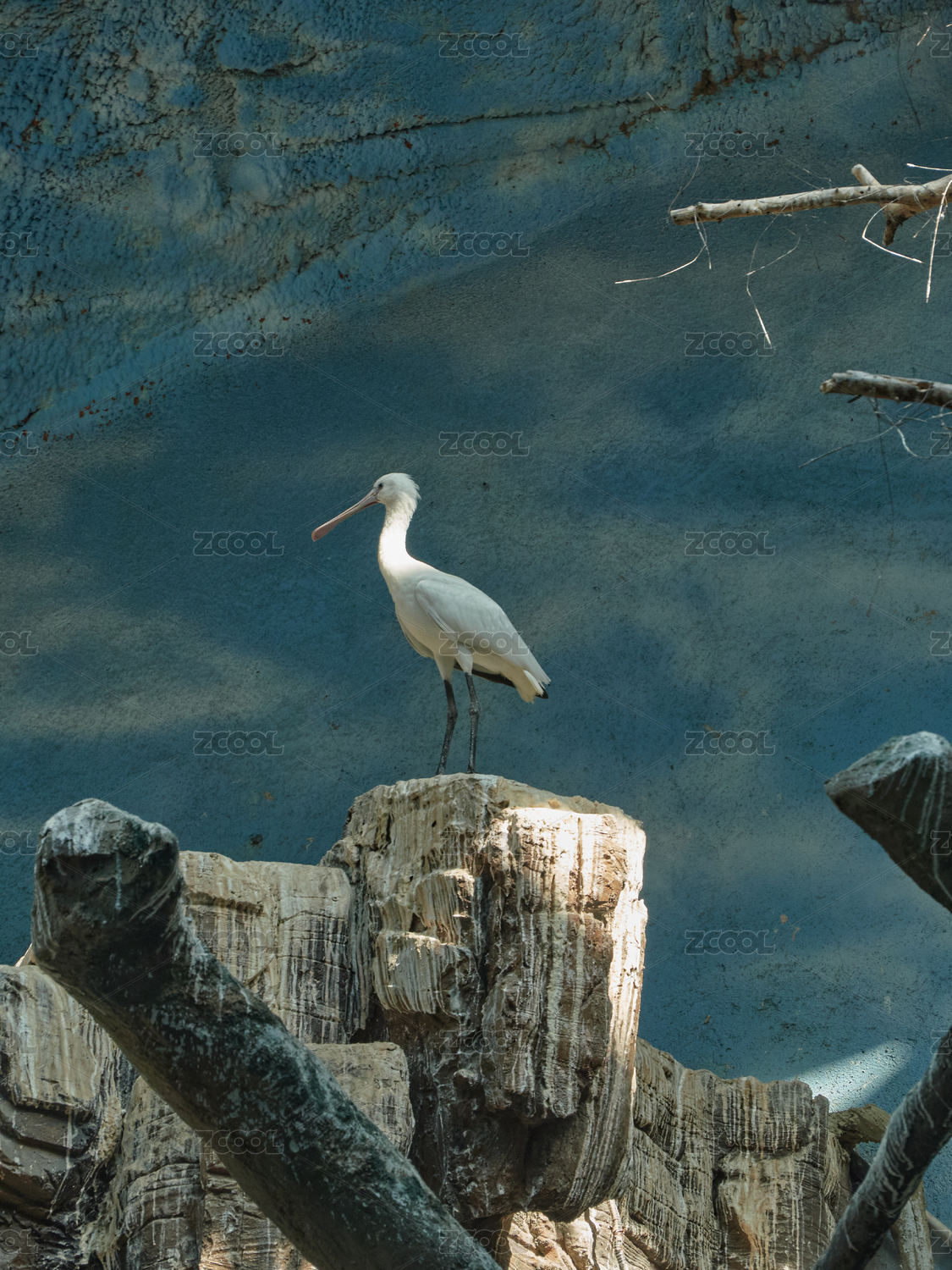 动物园内白琵鹭立于岩石上的景观