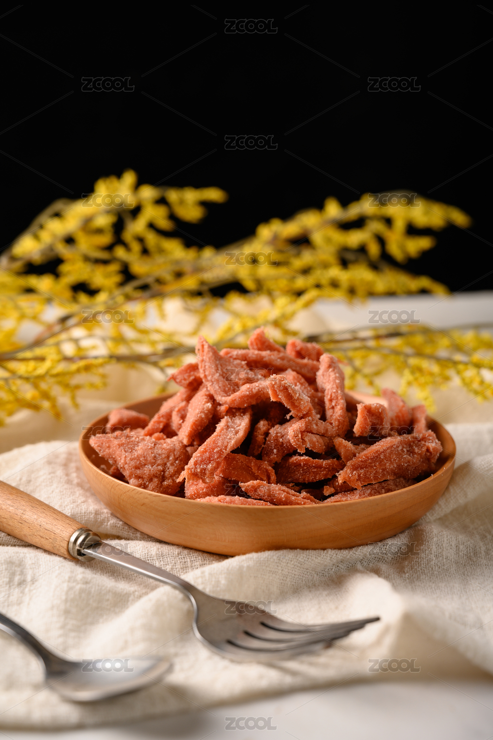 桌面上的木纹盘子里的金梅姜