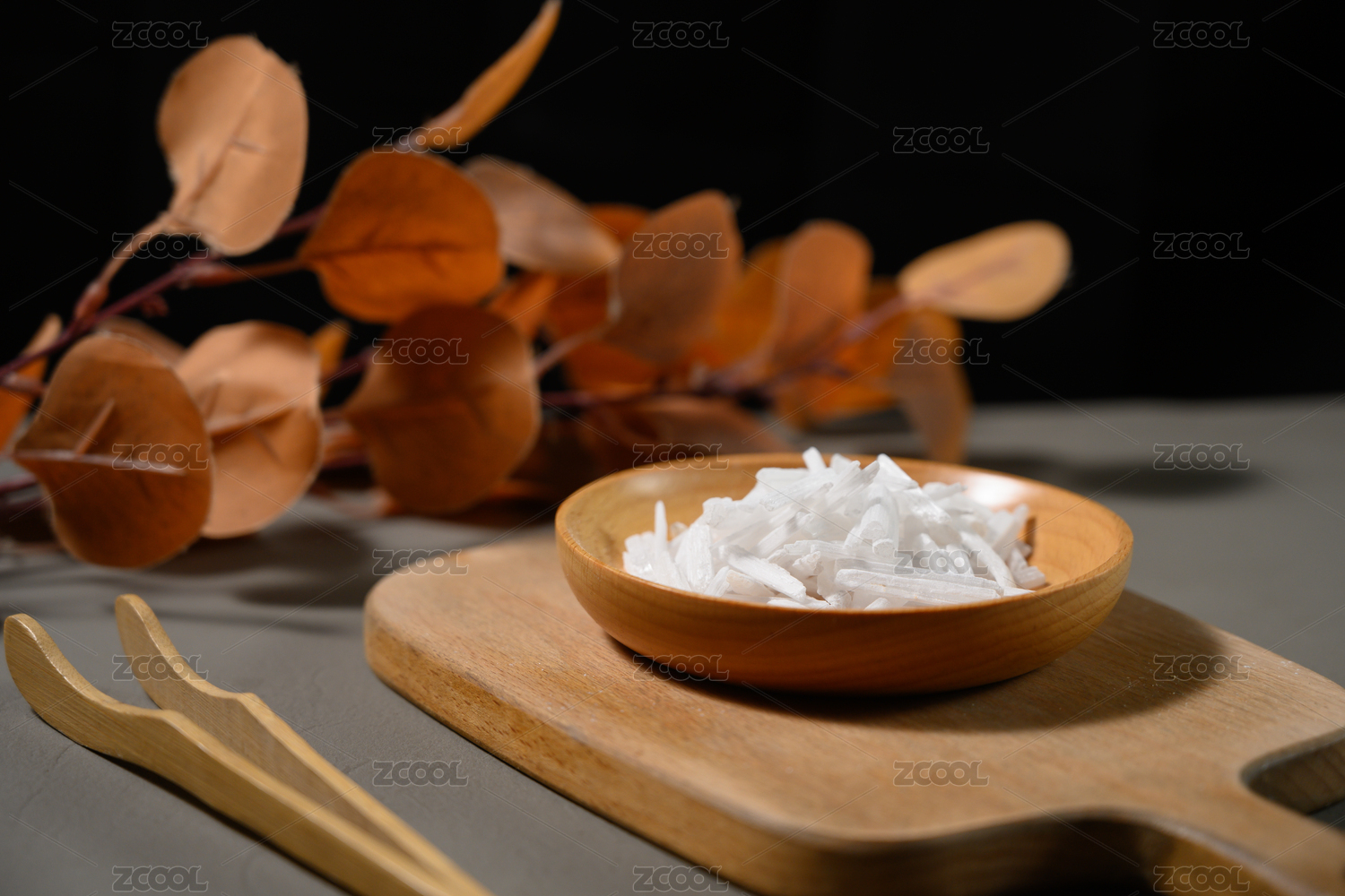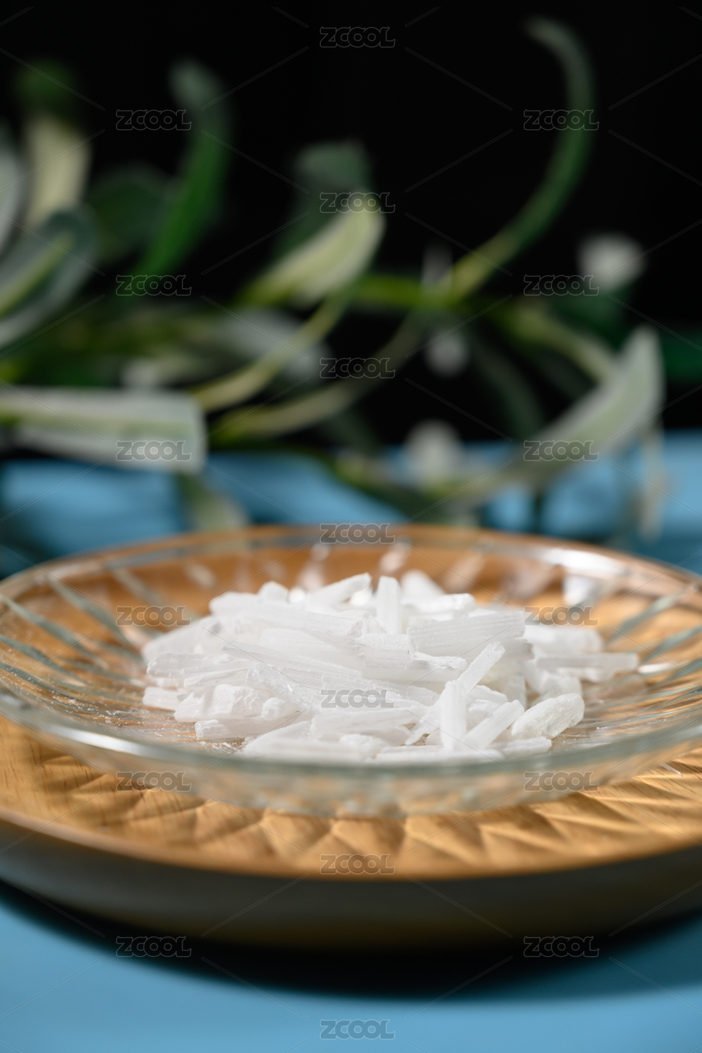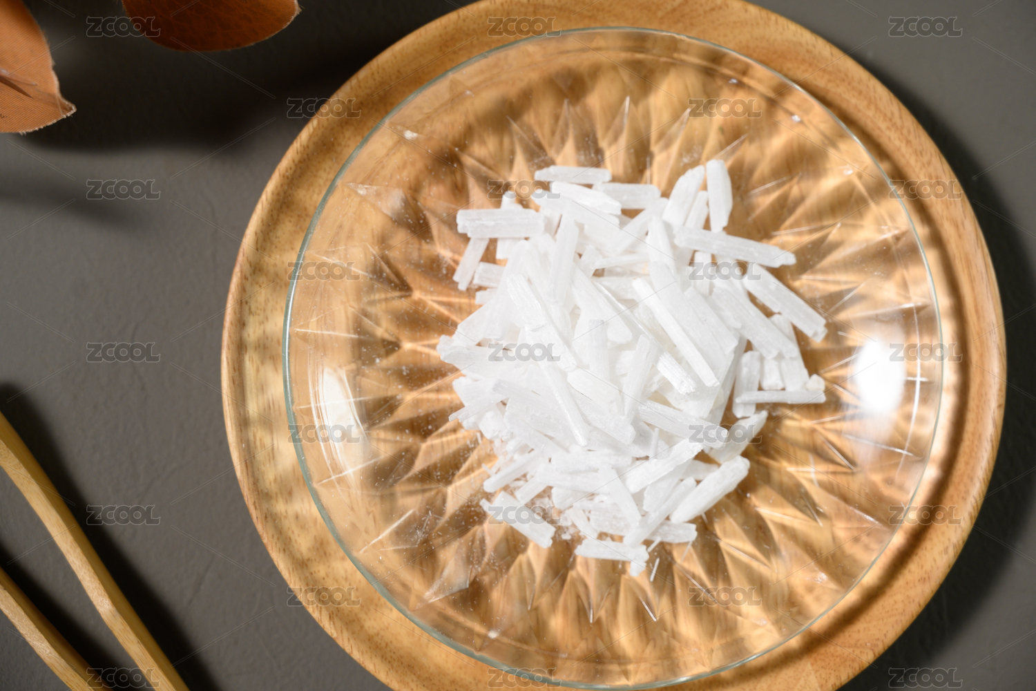 木桌上小木盘里的中草药:生石膏