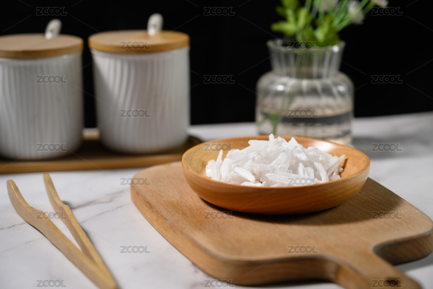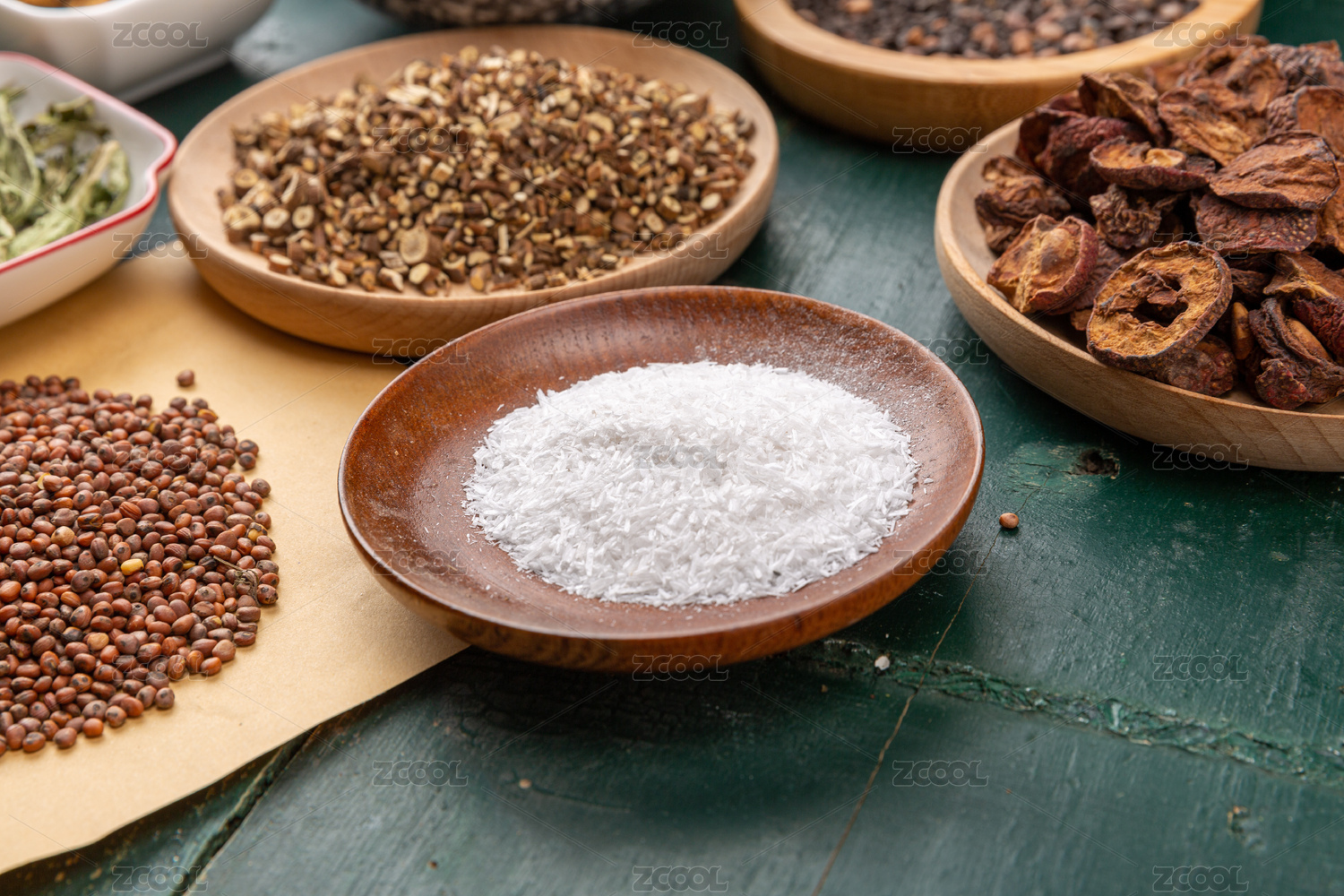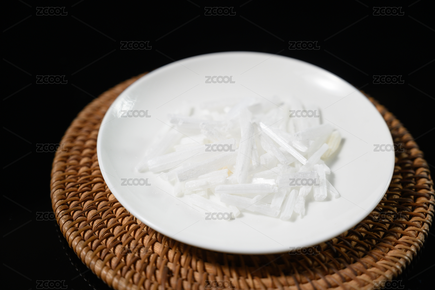 木桌上小木盘里的中草药:生石膏