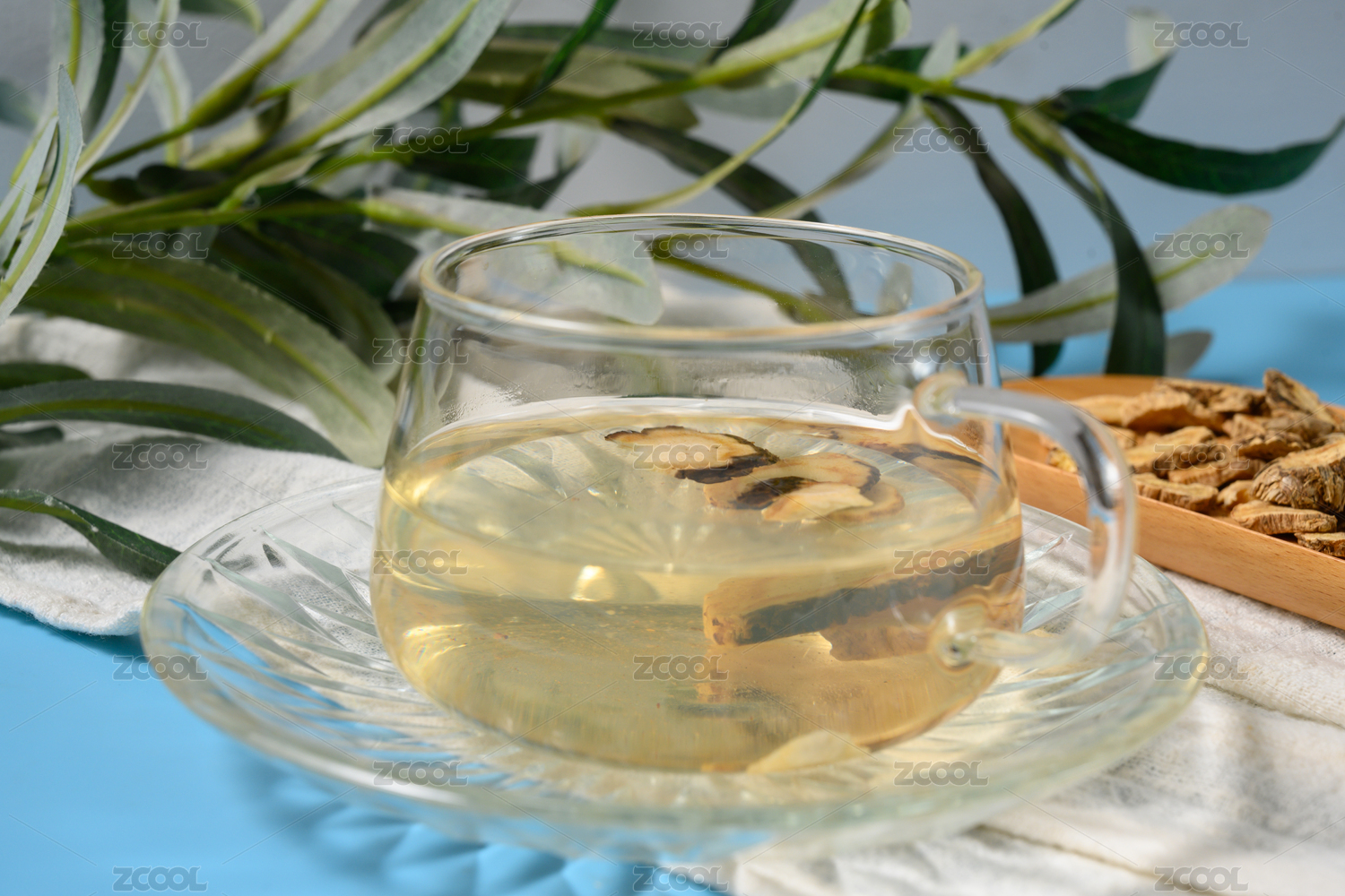 桌面上的杯子里的干爽的防风茶