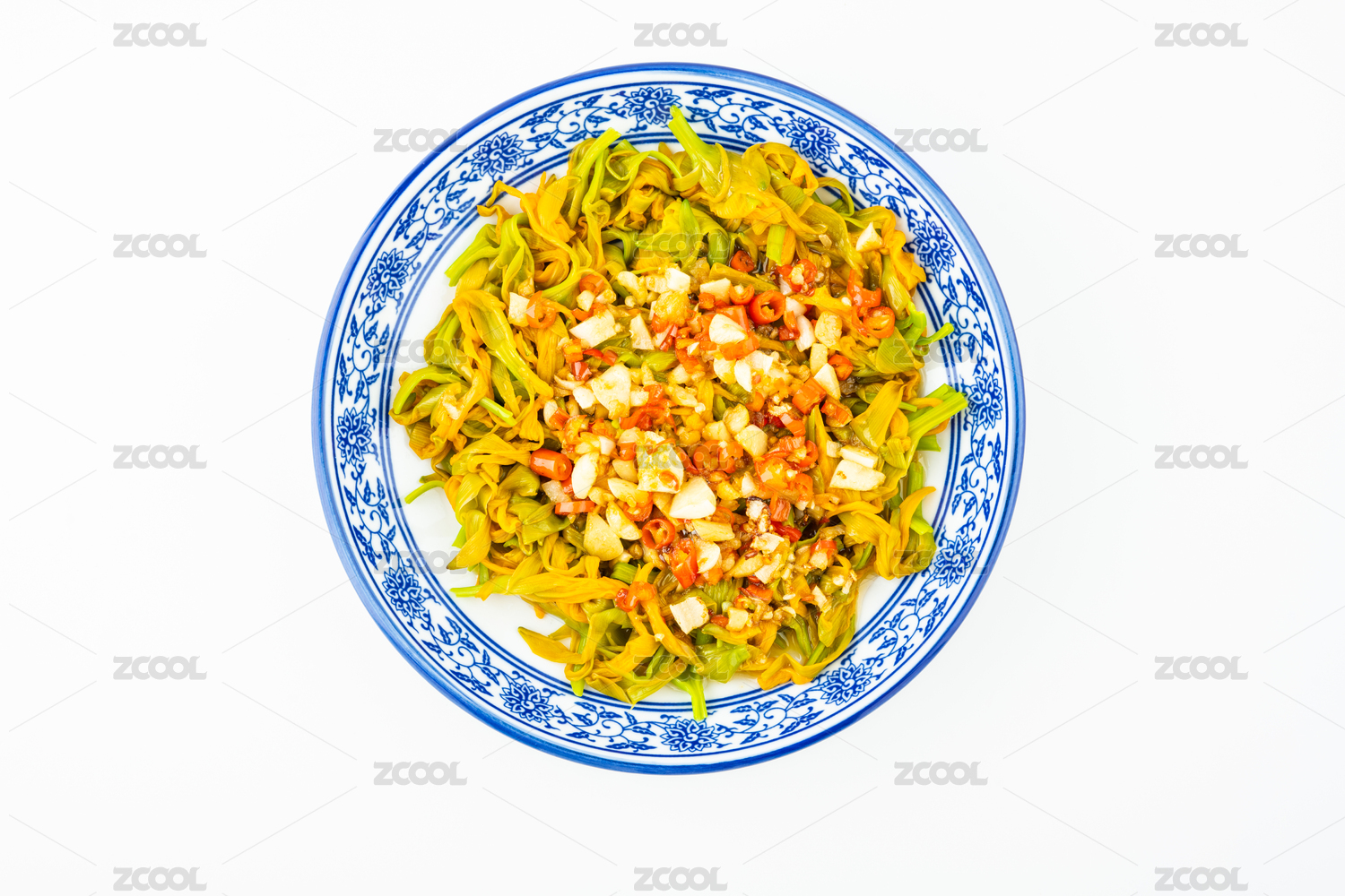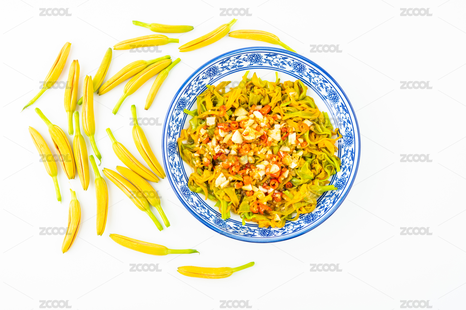 桌面上的盘子里的美味可口的凉拌黄花菜