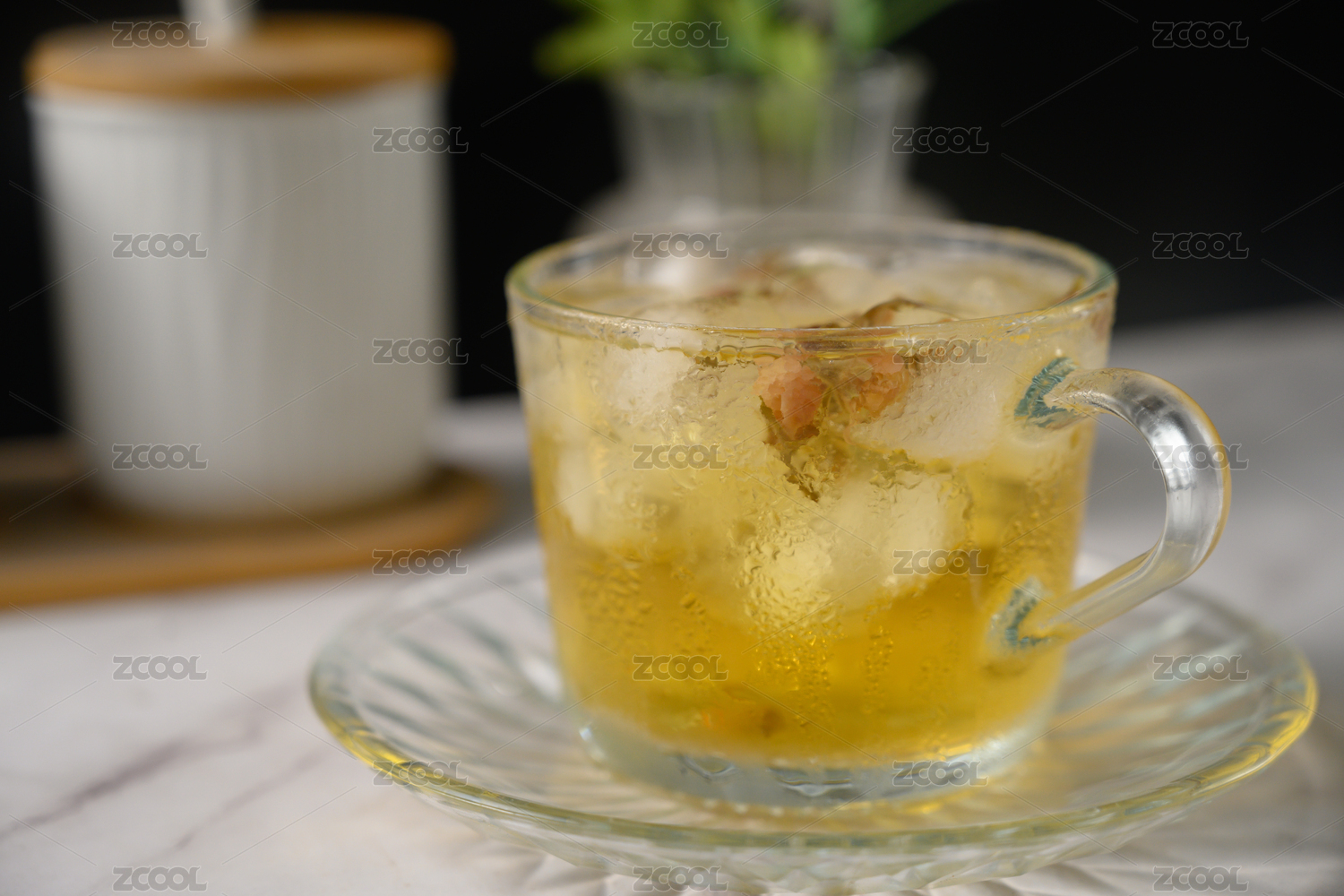 桌面上的杯子里的甘甜可口的冰苹果花茶