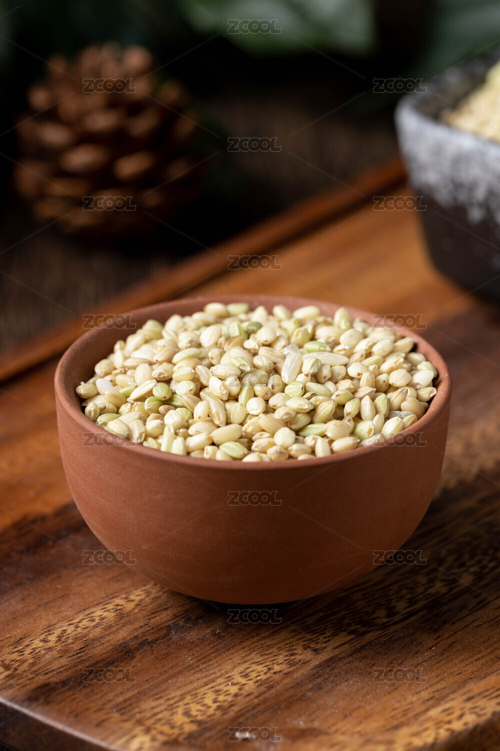 木底上放着一盘洋县绿香米和勺子上挖着香米