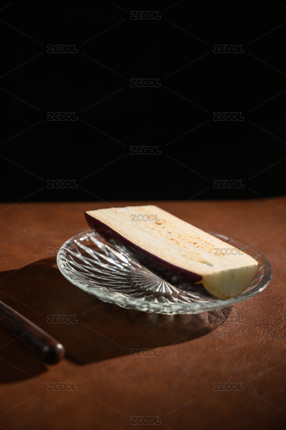 桌面上的盘子里的切开的美味可口的新鲜茄子