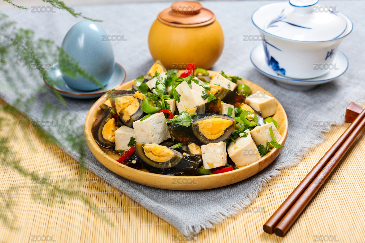 白色木板格子餐布皮蛋豆腐凉拌菜