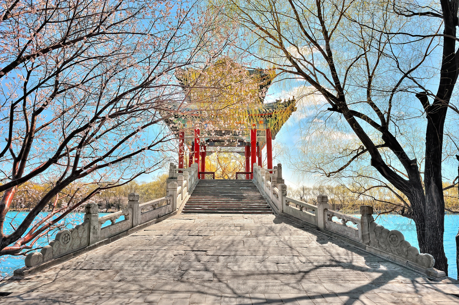 清晨阳光下的颐和园西堤桃花与练桥