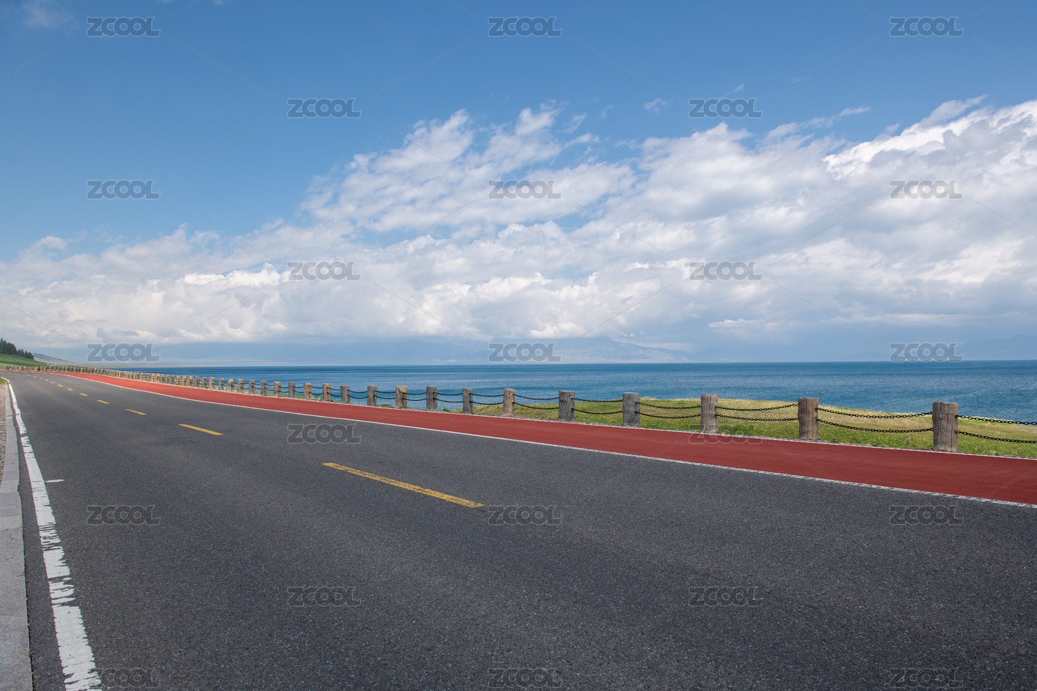 中国新疆博尔塔拉赛里木湖湖畔公路晴天风光