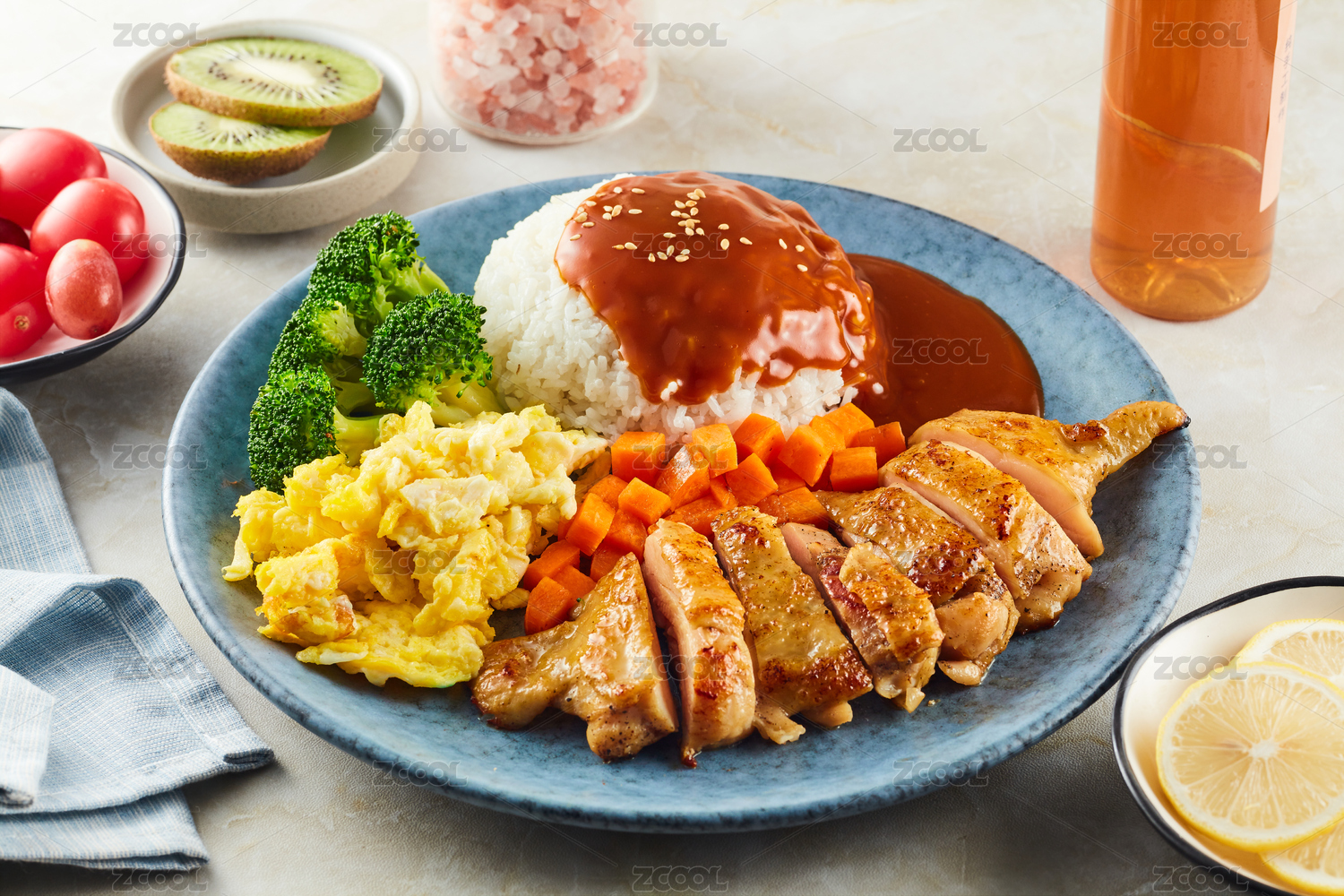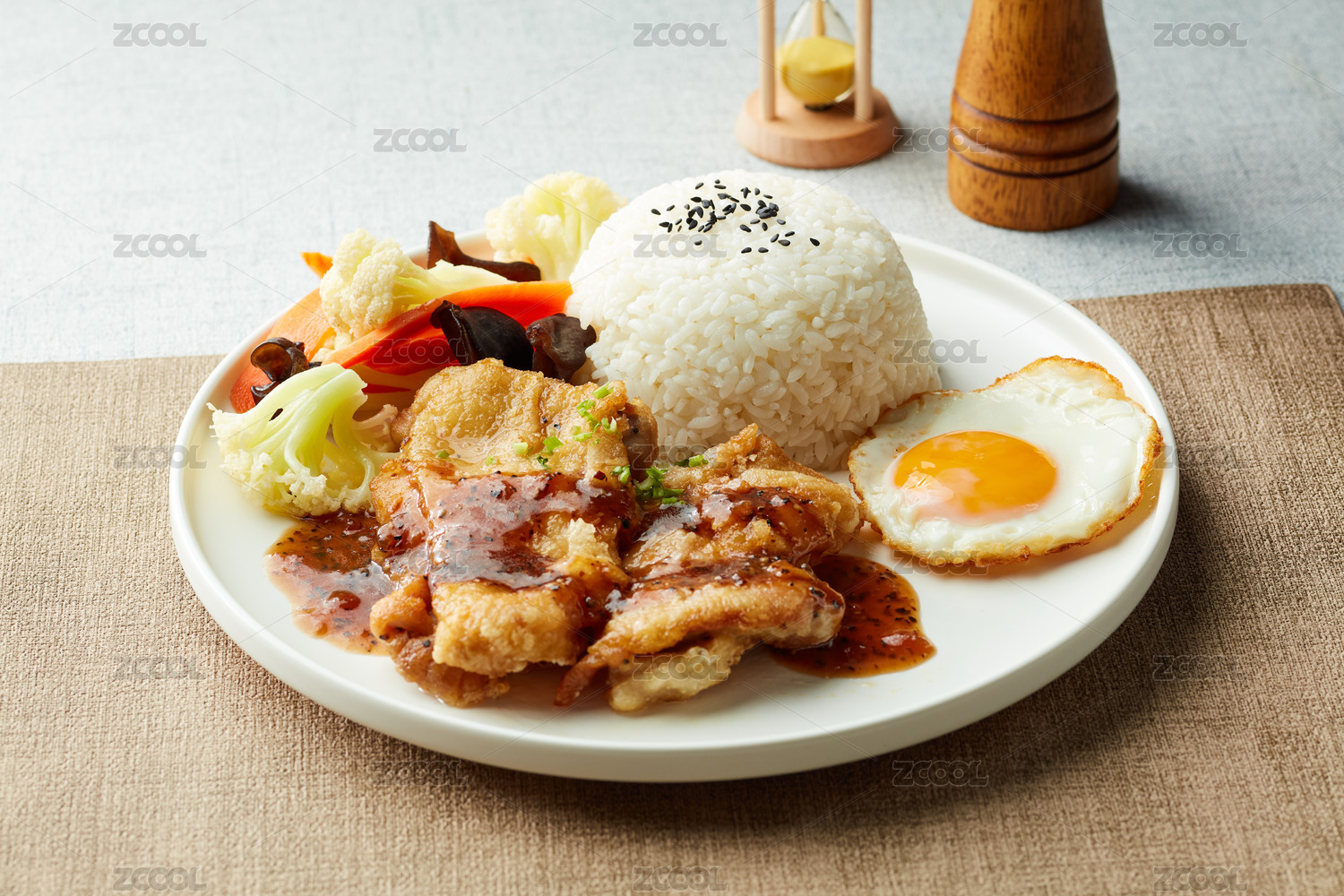 摆放在白色桌子上的外卖黑椒鸡排饭
