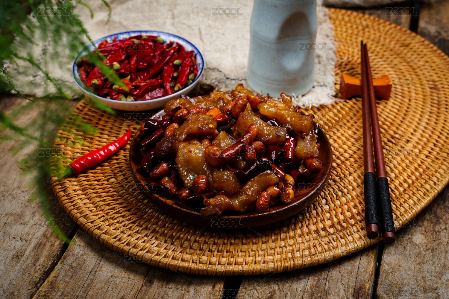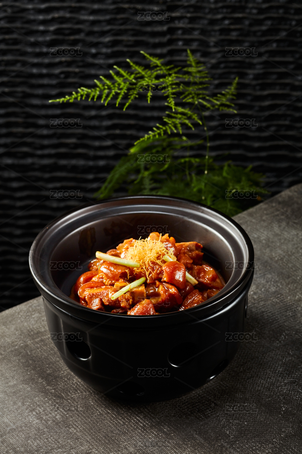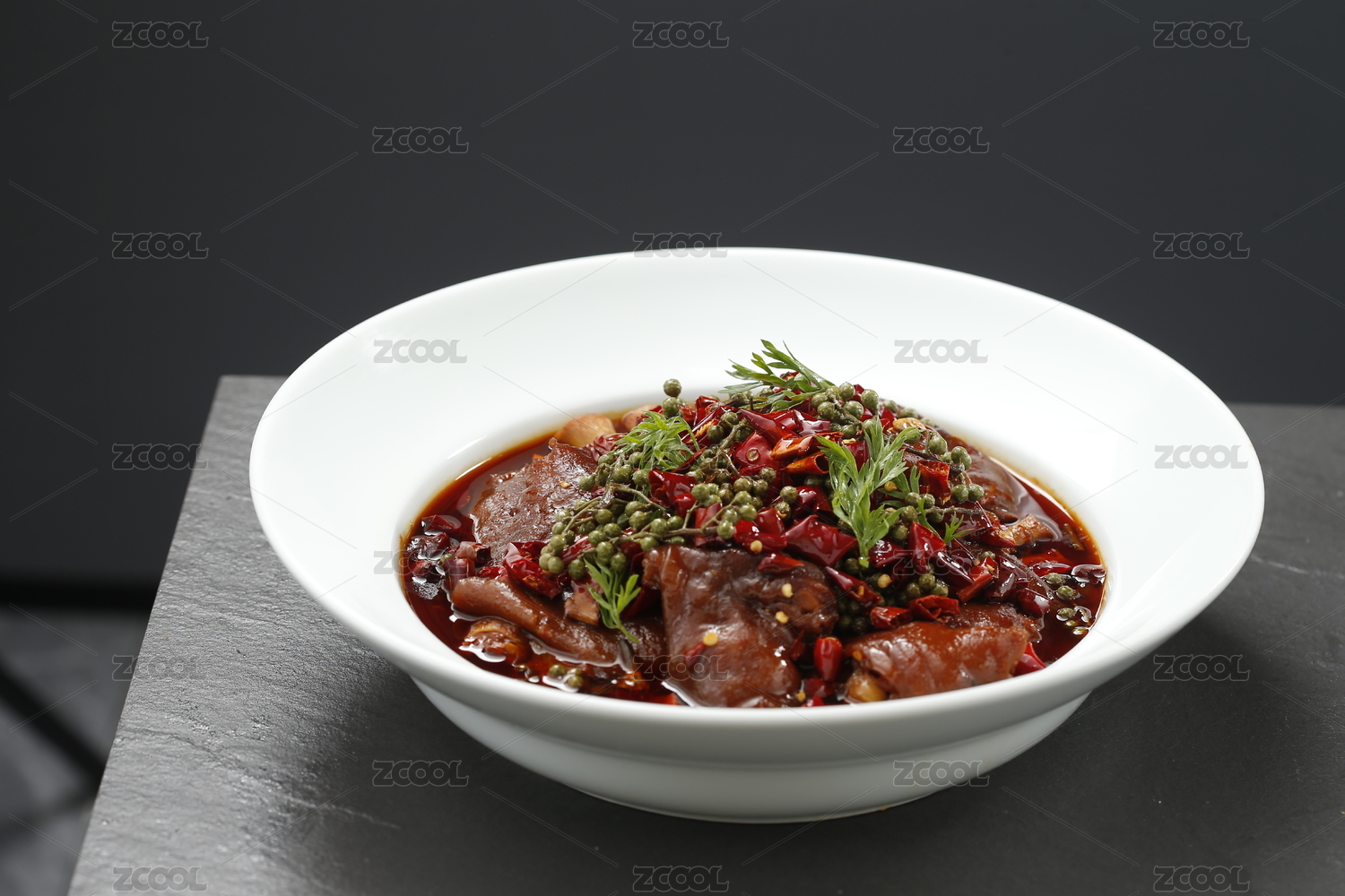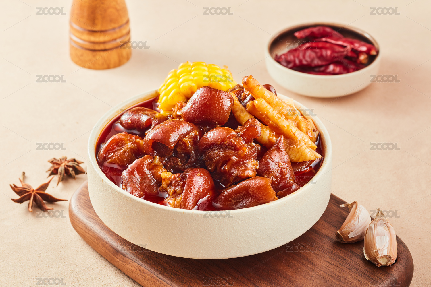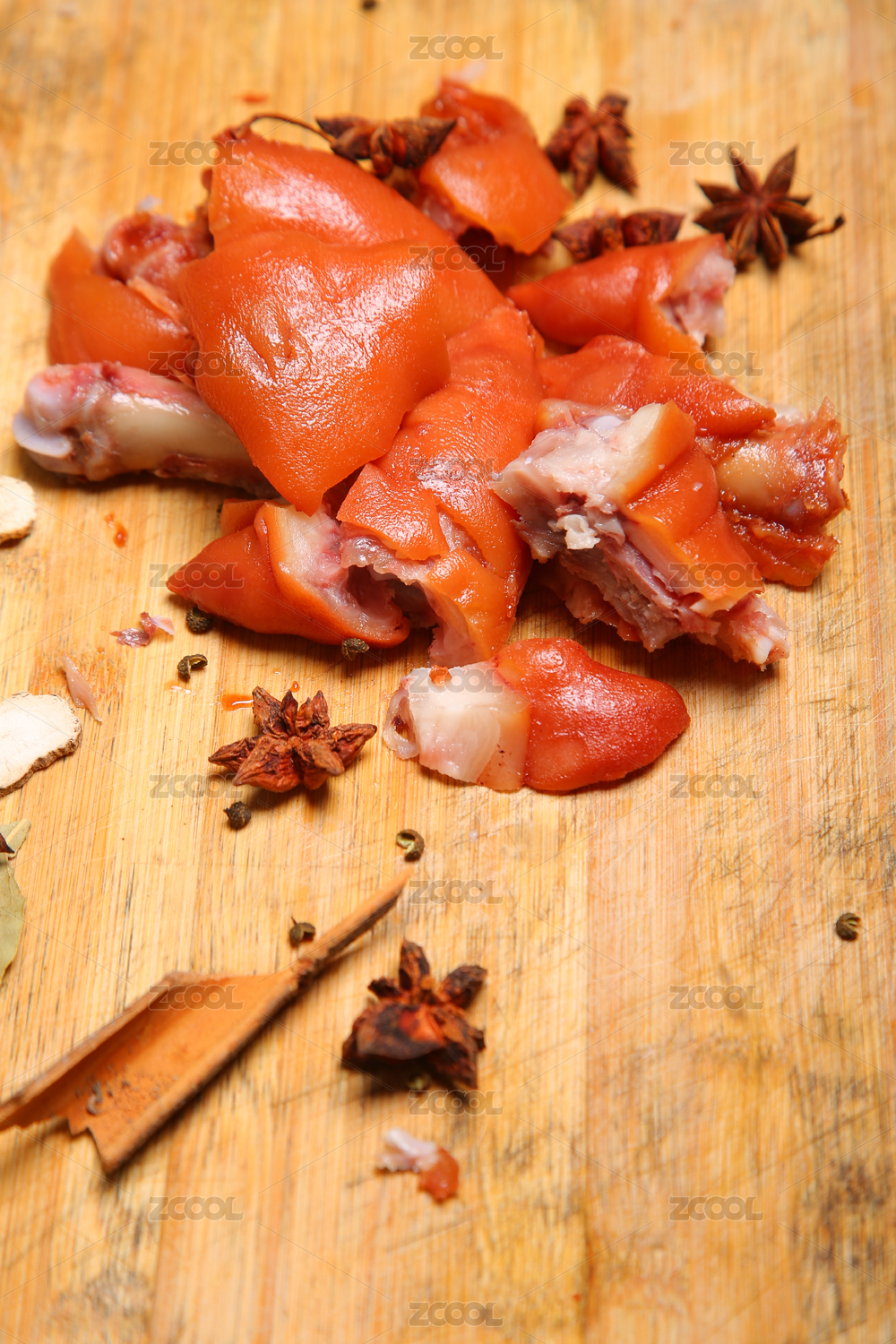 深色木板上摆放的香辣猪蹄