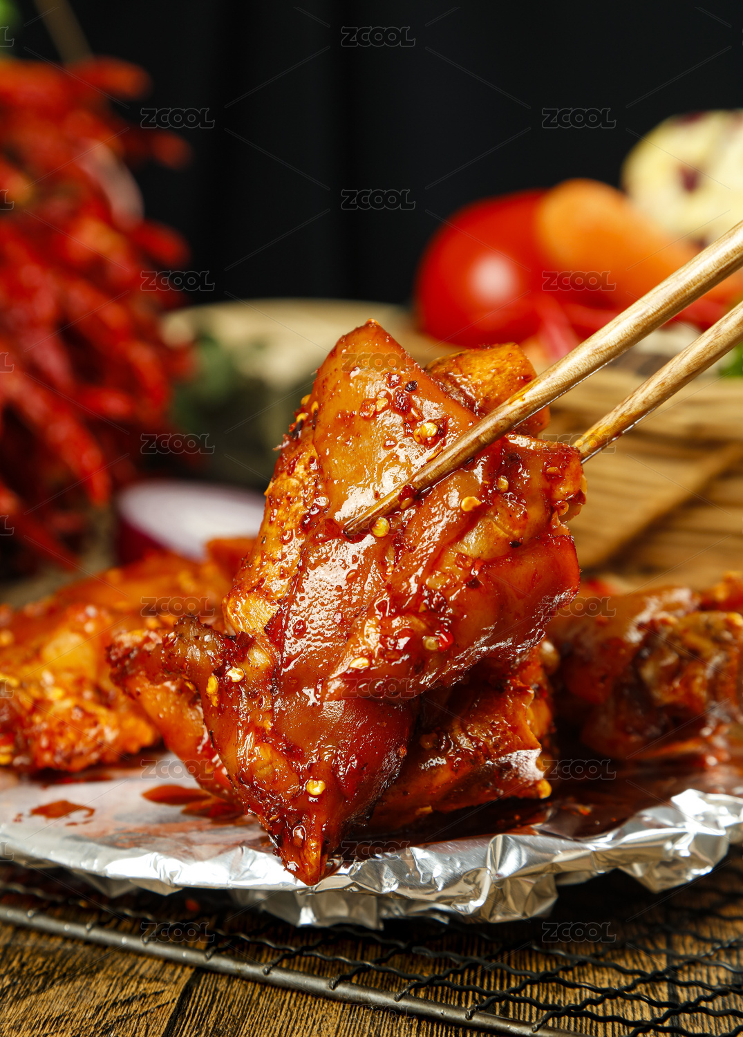 锡纸上放着一堆麻辣猪蹄子和筷子上夹着猪蹄