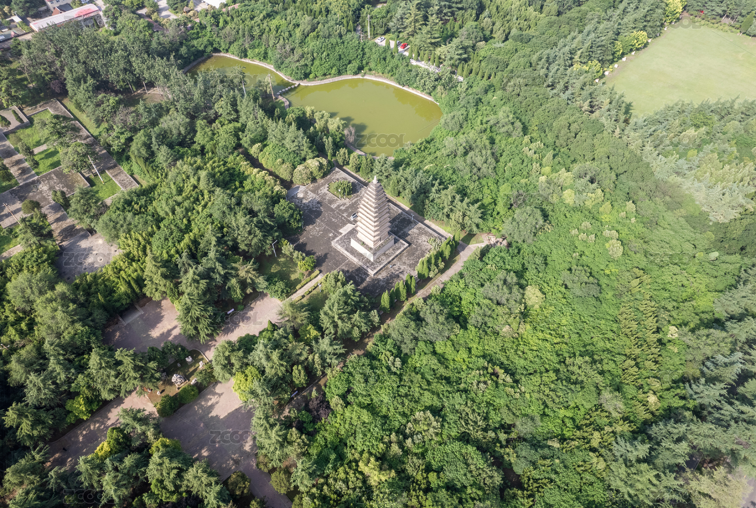 航拍河南三门峡黄河湿地公园宝轮寺塔大门