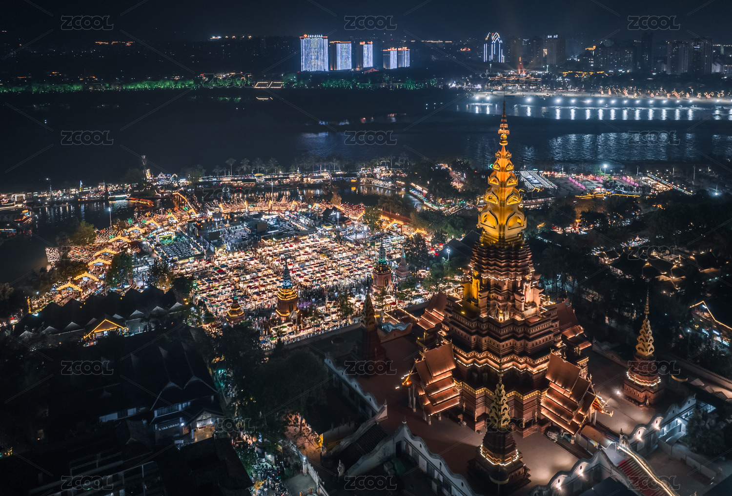 云南西双版纳景洪市告庄大金塔寺夜景航拍
