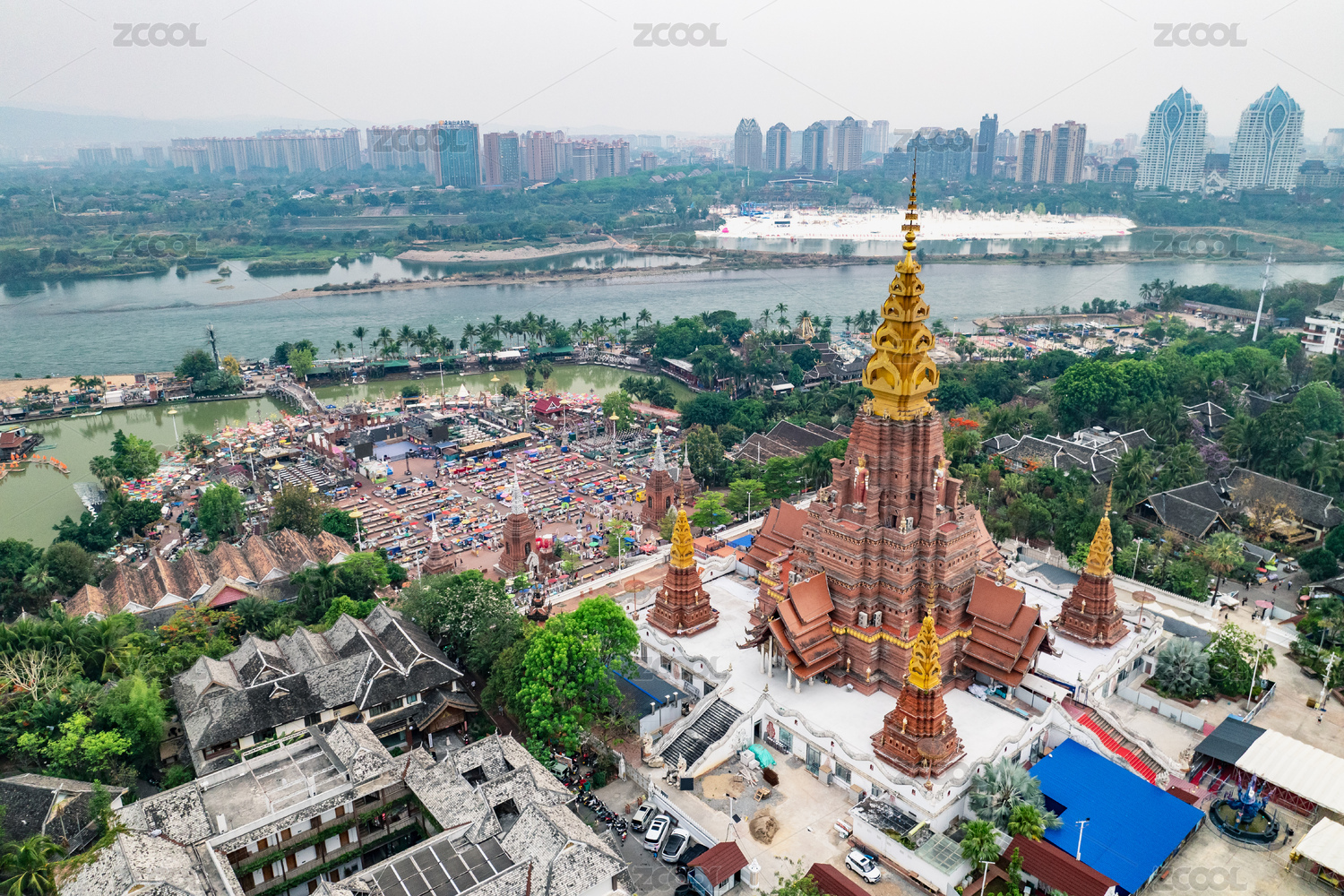 云南西双版纳景洪告庄西双景大金塔寺航拍