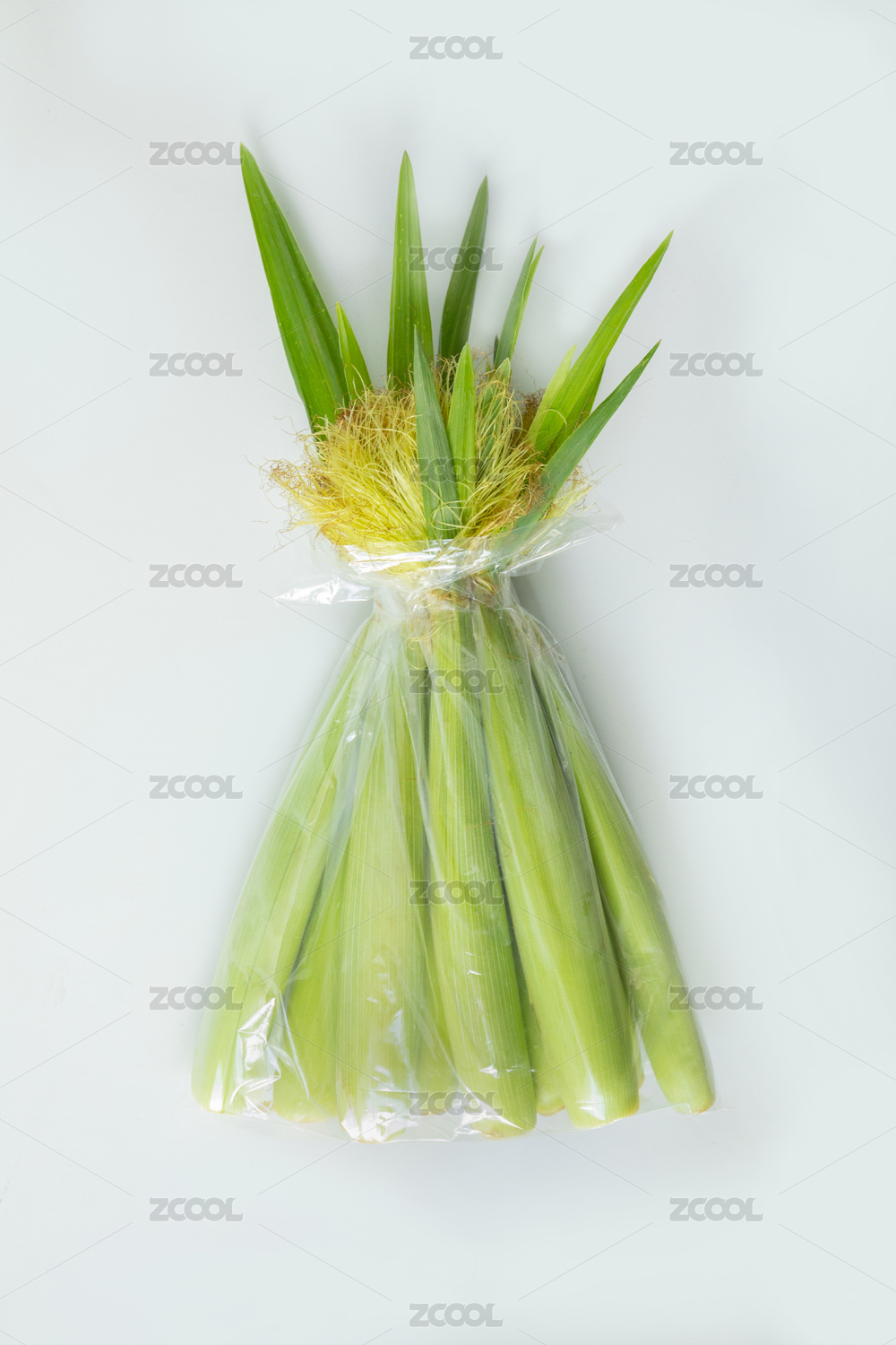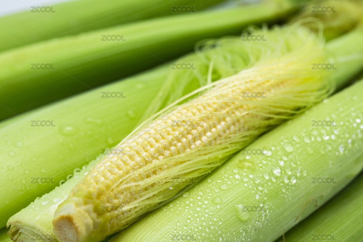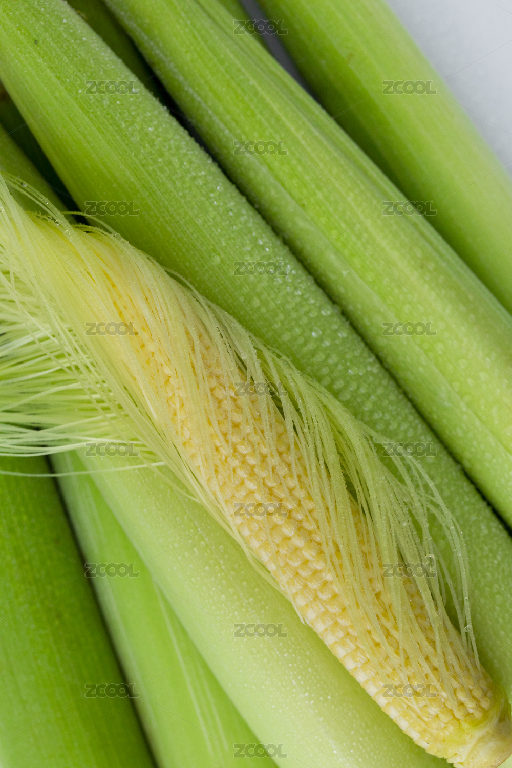拔开嫩壳的玉米笋与玉米笋在白背景