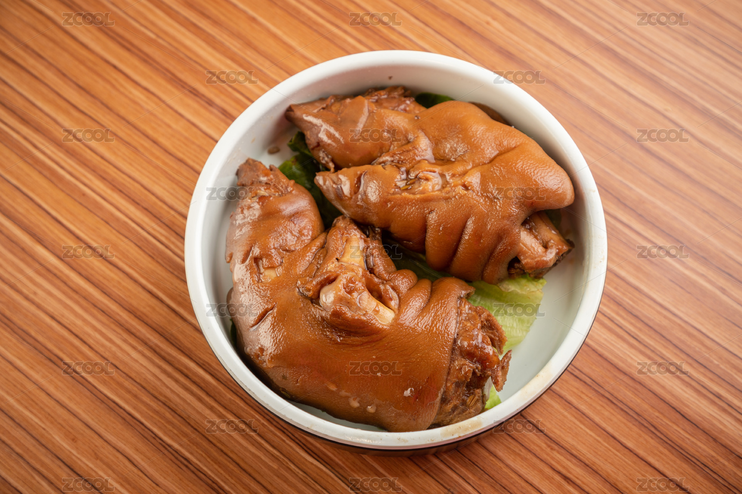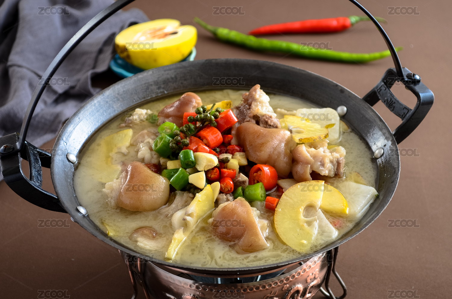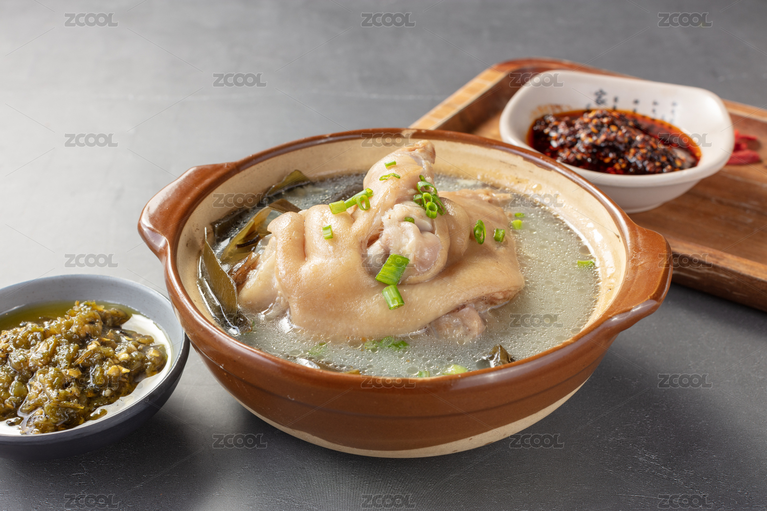 深底上放着一砂锅炖猪蹄和筷子上夹着猪蹄