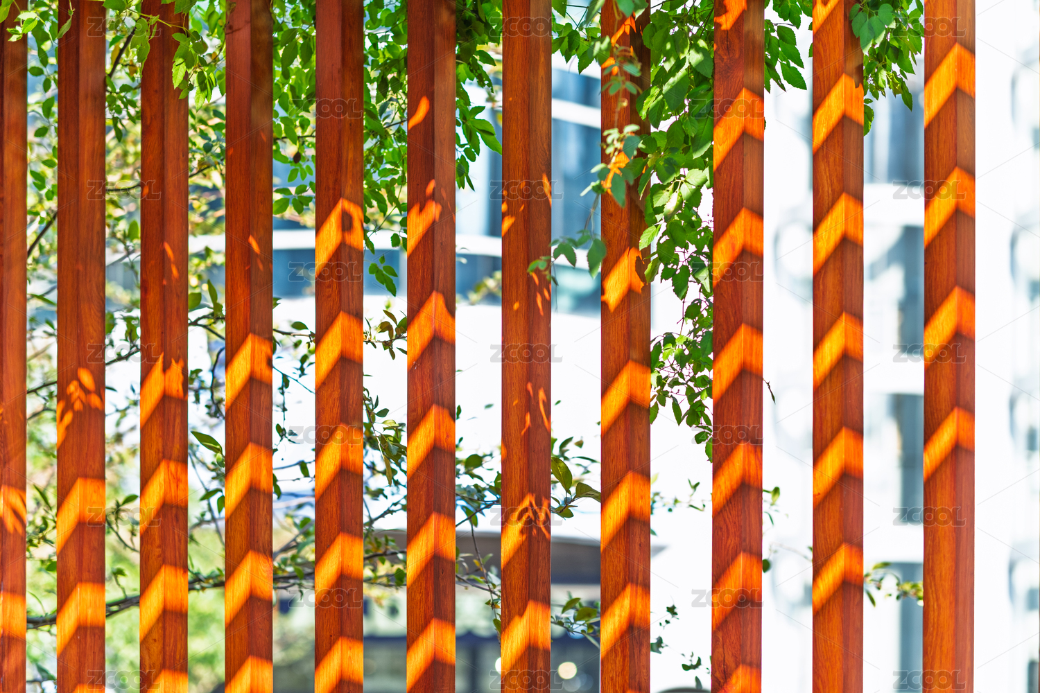 绿色树叶和光影下的红色栅栏