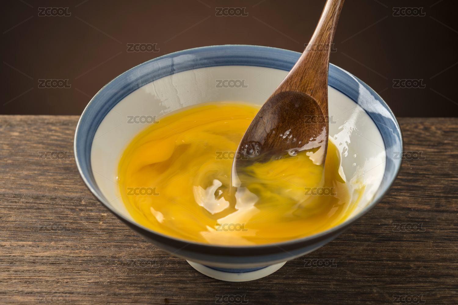 使用木勺打鸡蛋勺盛鸡蛋液特写木桌面背景