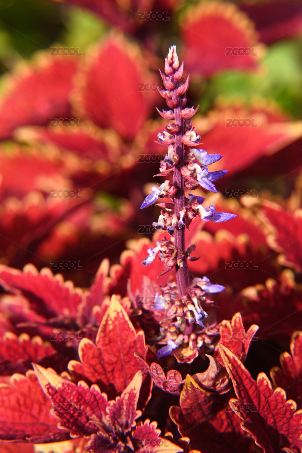晴天灿烂阳光下的五彩苏,红叶紫花