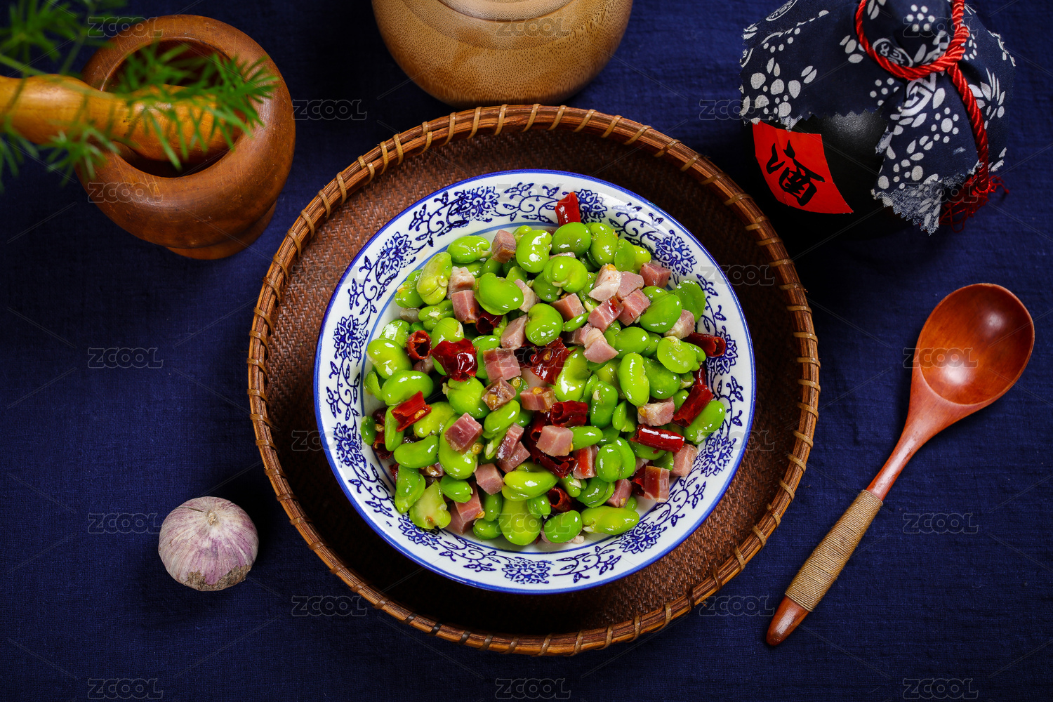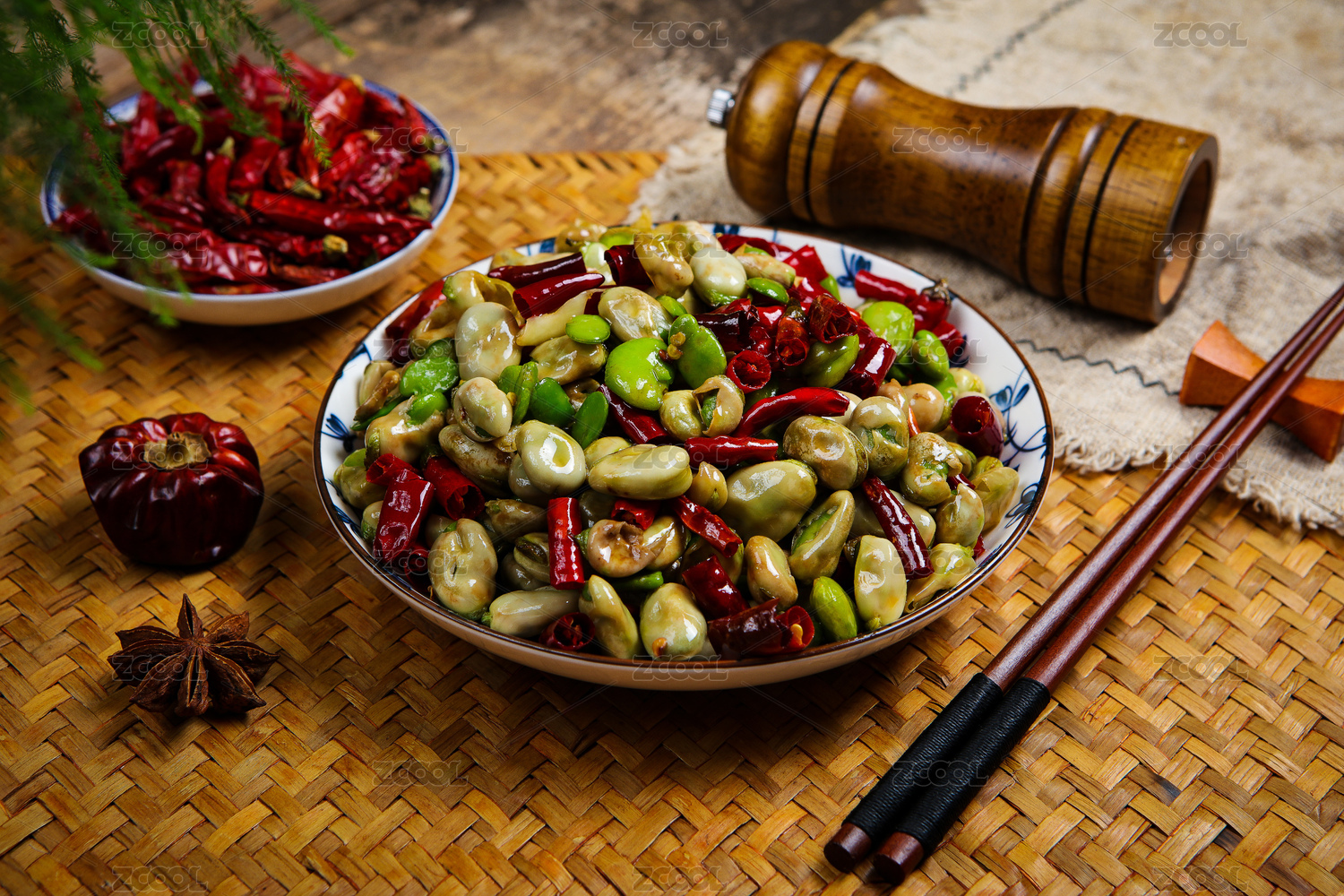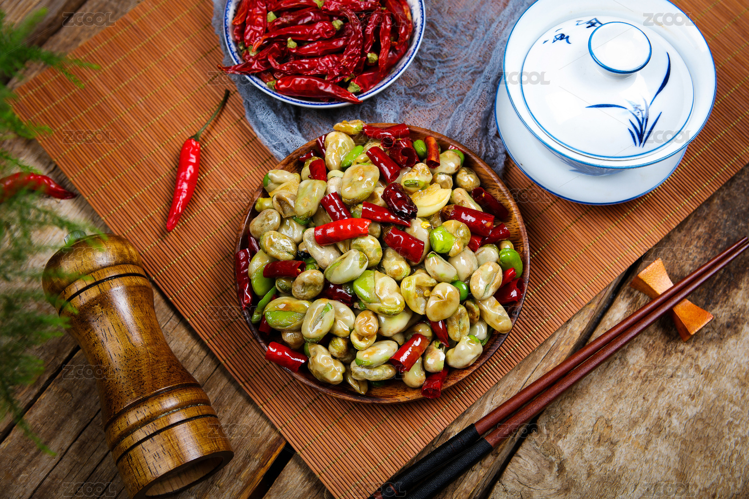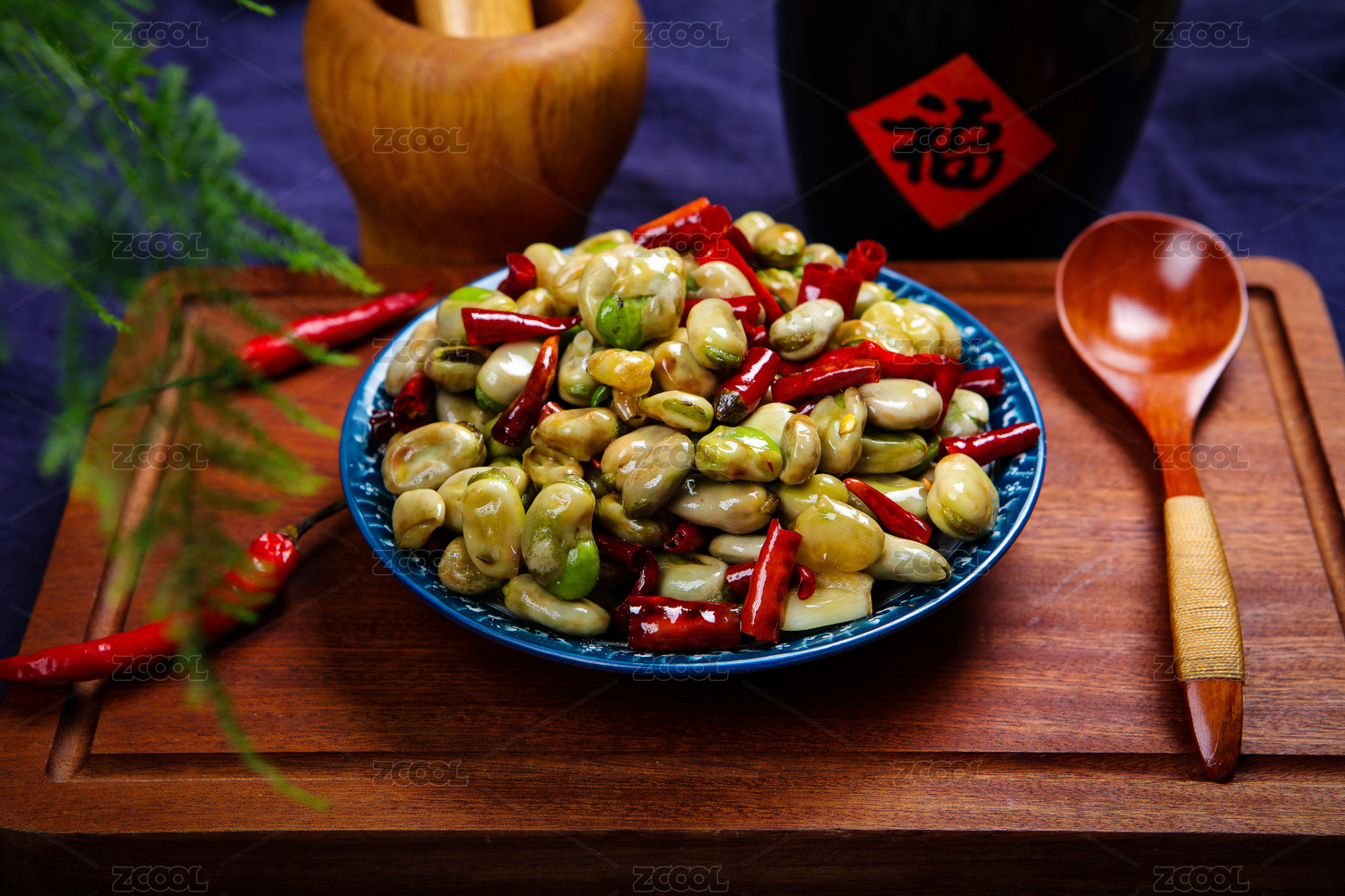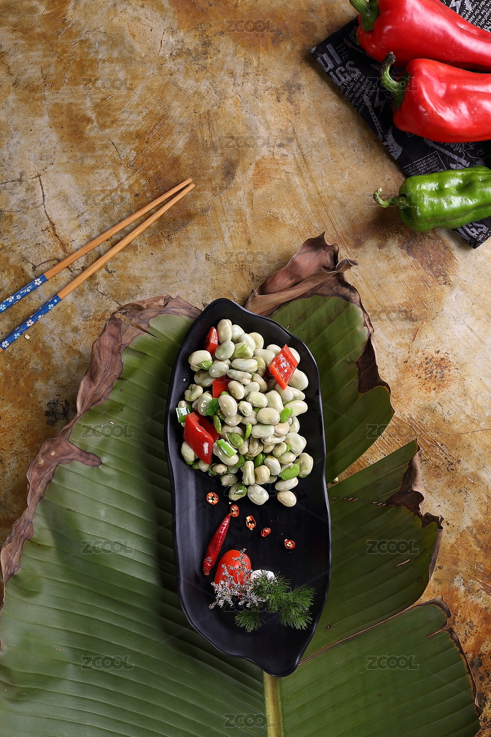 木芭蕉叶上黑盘里的辣椒炒蚕豆